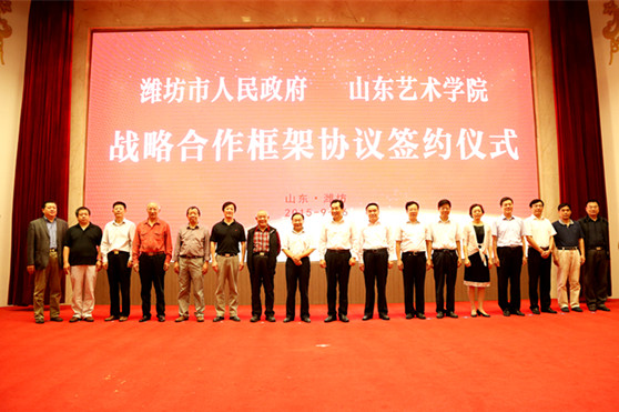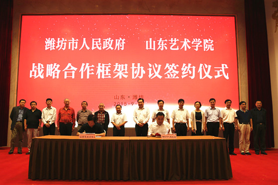 9月16日,山东艺术学院与潍坊市人民政府战略合作框架协议签约仪式在潍坊市举行。山东艺术学院党委书记李宗伟,院长张志民,副院长高启光;潍坊市委书记、市人大常委会主任杜昌文,市委常委、常务副市长邹庆忠等领导出席签约仪式,高启光、邹庆忠分别代表山东艺术学院和潍坊市人民政府签署战略合作框架协议。