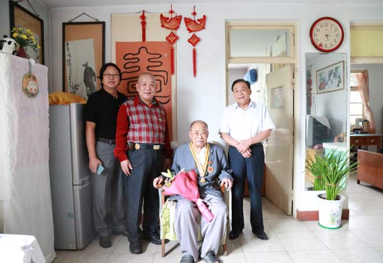 五位老人中,年龄最大的92周岁,最小的88周岁。在高九、成英华、李声远、王菊林同志的家中和张志学同志位于千佛山医院的病房里,学校领导亲切地同老同志们握手、交谈,并向他们的家人了解老人的身体和生活情况。李宗伟讲到,中国人民抗日战争暨世界反法西斯战争胜利70年了,老同志们为这来之不易的胜利作出了重要贡献,今天的幸福生活和老同志们的浴血奋斗息息相关,党和人民永远不会忘记,他代表学校党委和行政向他们表示深深的敬意。学校领导为老同志们戴上了由中共中央、国务院、中央军委授予的中国人民抗日战争胜利70周年纪念章,为他们送上鲜花,并合影留念。