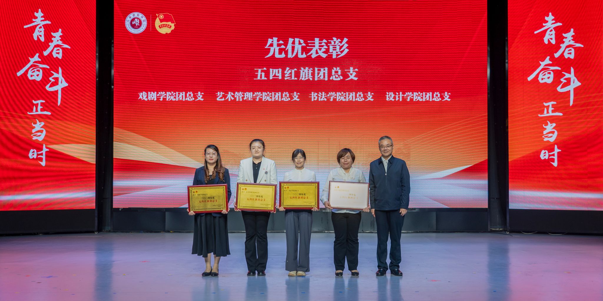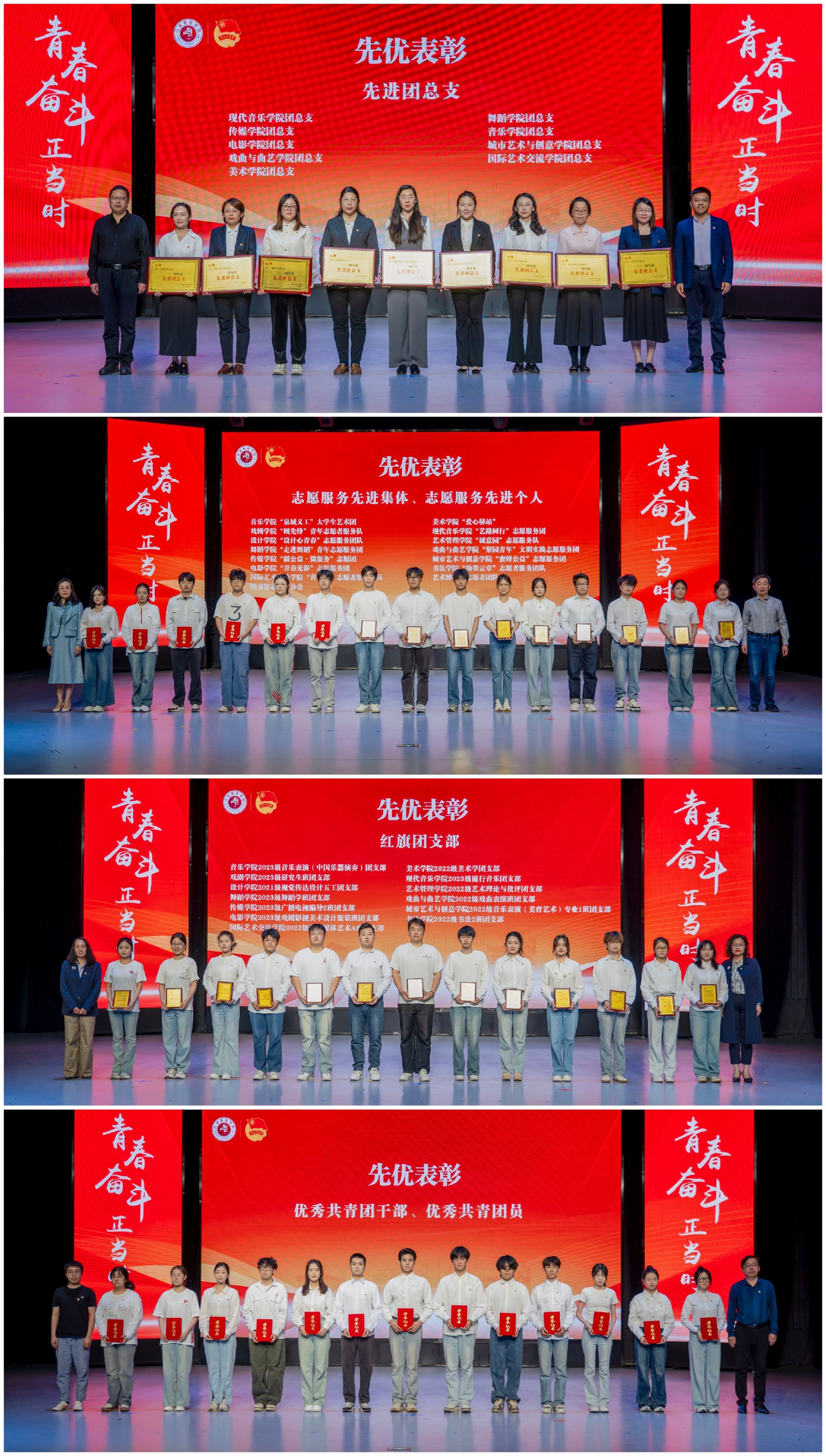 苏茂兴代表学校党委向全校共青团员、青年师生们致以诚挚问候和美好祝愿,向受到表彰的先进集体和个人表示祝贺,向全校团学组织、全体团学干部和广大团员青年提出希望和要求。一是要以“青春进行时”的姿态锤炼过硬本领,在课堂上钻研专业知识,在“第二课堂”中磨砺担当,以“艺精于勤”的态度深耕专业领域,锻造“能干事、干成事”的真本领。二是要以“青春引路人”的信念筑牢理想之基,坚持以习近平新时代中国特色社会主义思想为指引,自觉从党的百年奋斗史和五四精神中汲取力量,将个人理想融入“国之大者”,明晰奋斗方向。三是要以“青春向未来”的担当书写时代答卷,在艺术创作中以“有筋骨、有道德、有温度”的作品记录时代,在服务社会中以“挺膺担当”的行动践行初心,在学校建设中以“主人翁”的姿态贡献智慧力量。