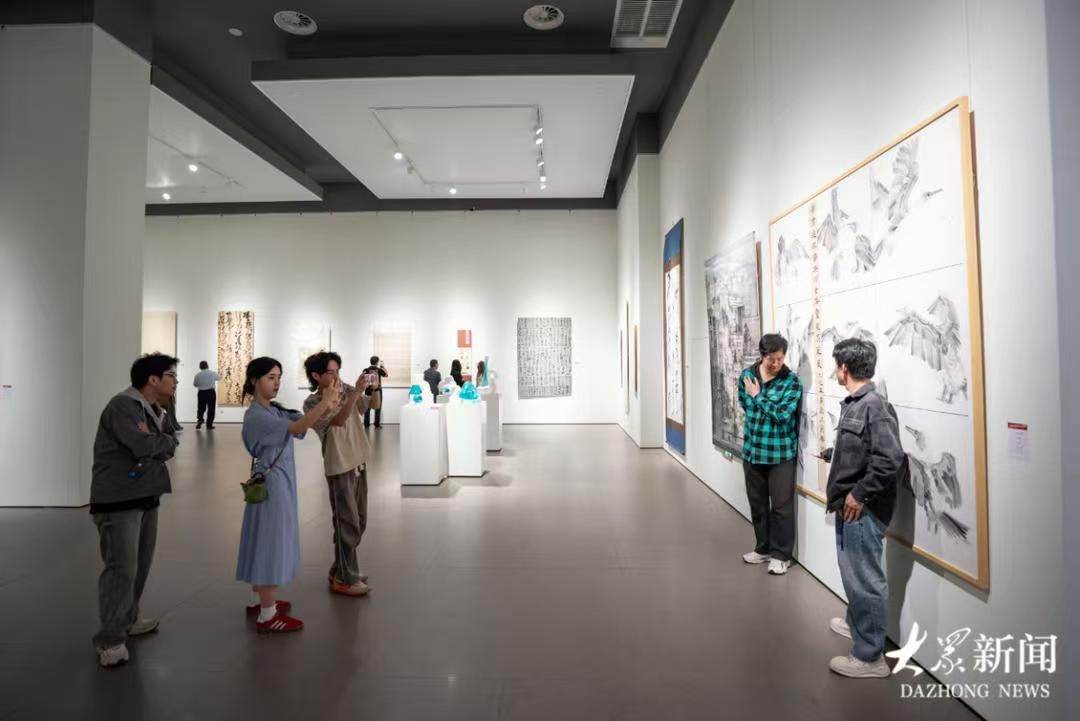 开幕式上,到场领导上台一起推动启幕仪,金沙缓缓流下,宛如一幅徐徐展开的画卷,为展览正式拉开帷幕。美术学院2025届中国画专业研究生白凯杨代表参展毕业生发言。