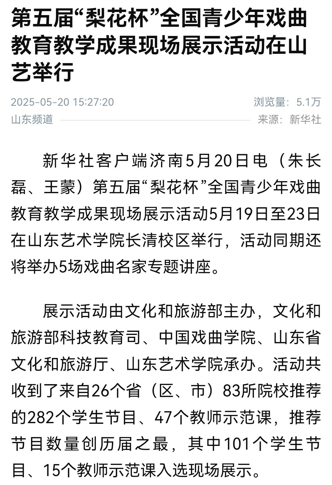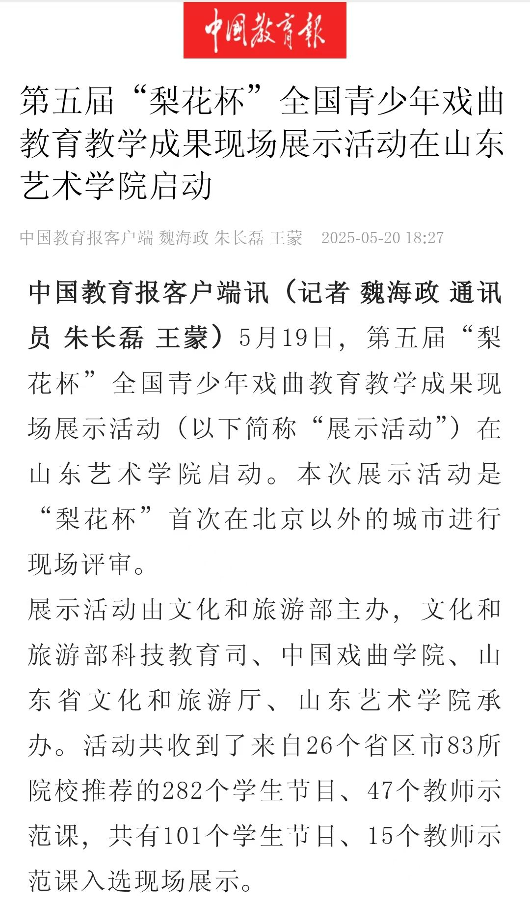 5月19日至23日,第五届“梨花杯”全国青少年戏曲教育教学成果展示活动现场评审环节在我校举行。本届梨花杯由文化和旅游部主办,文化和旅游部科技教育司、中国戏曲学院、山东省文化和旅游厅、山东艺术学院共同承办。来自42个院校的1200余名戏曲师生精彩亮相,在梨花杯的舞台上绽放着戏韵风采,展现了戏曲穿越古今的独特美丽,也体现了青少年学子为戏曲艺术传承发展注入的生机与活力。