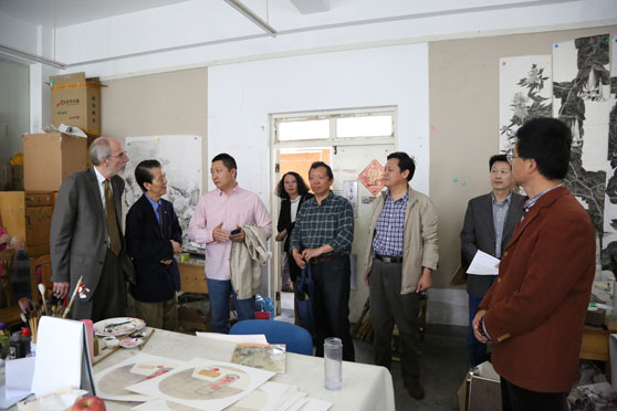 随后,在美术学院、舞蹈学院及国际交流合作处相关负责同志的陪同下,唐恩.罗伯逊一行参观了山东艺术学院美术学院各专业的教学情况及作品展、舞蹈学院的剧目排练、国际艺术交流学院形象设计专业教学实践情况。在美术学院国画系办公室,张志民会见了唐恩.罗伯逊一行,并就国内外美术、设计学科相关问题进行了交流。唐恩.罗伯逊一行对山东艺术学院的教学水平和专业特色给予了很高的评价,并与国际交流合作处负责人就两校下一步互派展演团、交换生、访问学者等具体合作事宜进行了深入探讨。