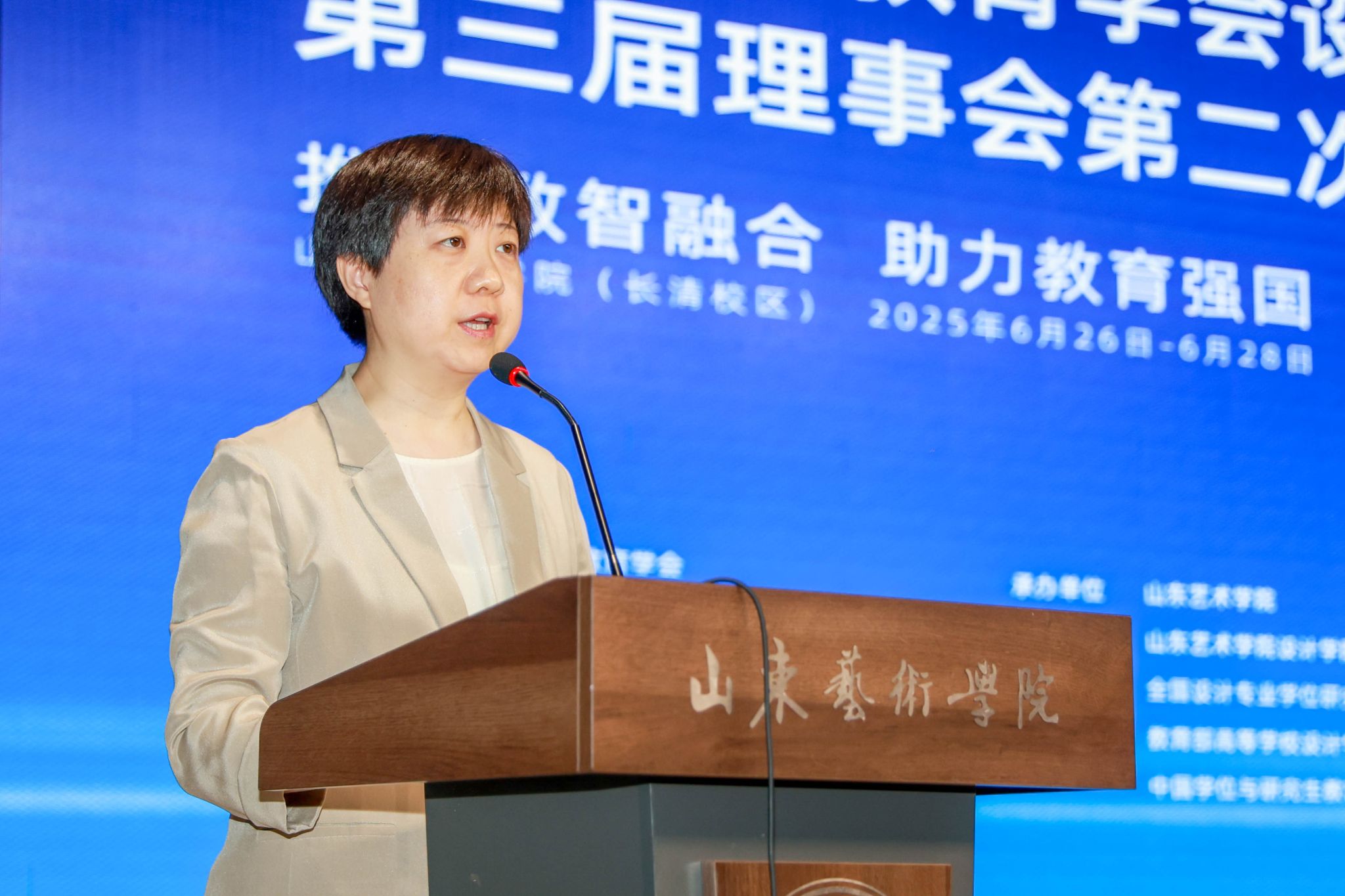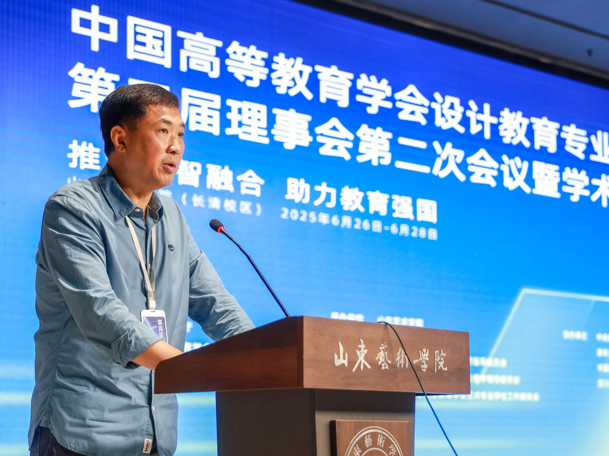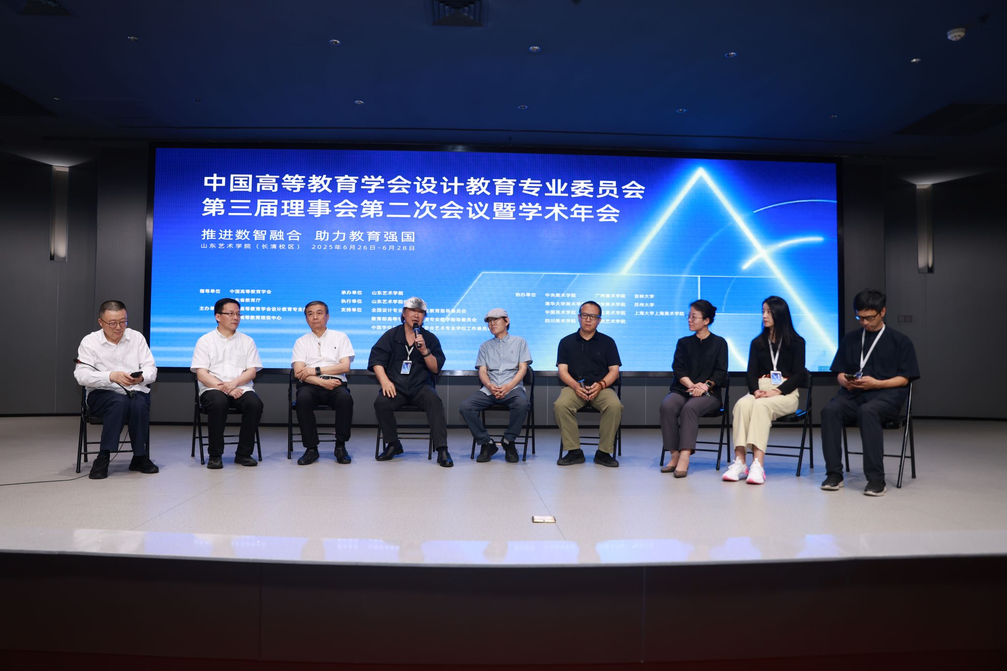 6月26至28日,中国高等教育学会设计教育专业委员会第三届理事会第二次会议暨学术年会在我校长清校区召开,年会由中国高等教育学会设计教育专业委员会、中国高等教育培训中心主办,山东艺术学院承办,主题为“推进数智融合 助力教育强国”,山东省文联主席、山东省美术家协会主席、山东艺术学院院长徐青峰出席会议并致辞。中国高等教育学会设计教育专业委员会(以下简称专委会)秘书长、清华美院副院长杨冬江主持专委会理事会和开幕式。专委会理事长、清华美院原副院长何洁传达了中国高等教育学会第八届理事会第十次会议精神、宣读了设计教育专委会年度工作报告。专委会常务理事、副秘书长刘德坤解读了2025年度科研工作计划及理事会员发展工作情况。