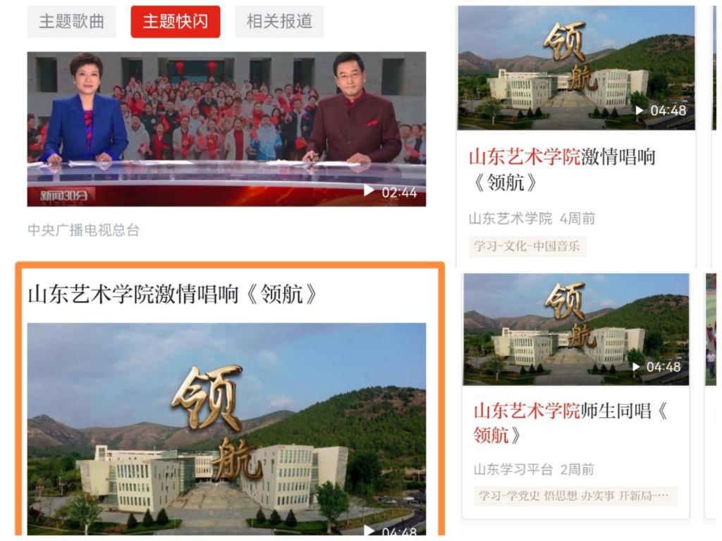 1月31日,山东艺术学院激情唱响《领航》MV在“学习强国”山东学习平台发布。2月2日,被推荐到学习强国“学习-学党史 悟思想 办实事 开新局-青春向党”“学习-文化-中国音乐”栏目收录。