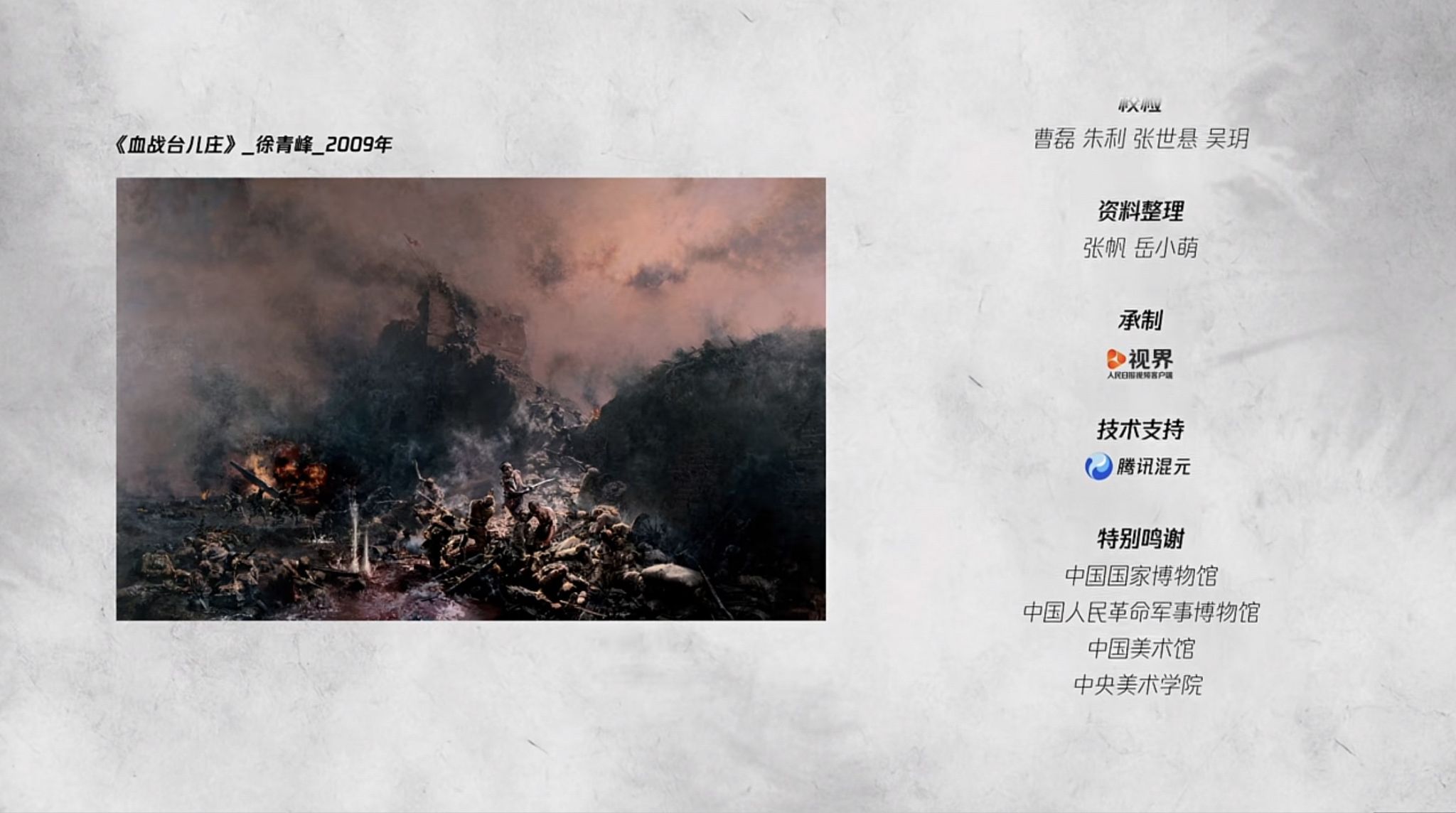 为纪念中国人民抗日战争暨世界反法西斯战争胜利80周年,人民日报社特别策划制作的“江山如画”系列短视频第一期《不屈》于8月18日全网上线。视频援引了山东艺术学院院长徐青峰的大型历史油画作品《血战台儿庄》,展现了中国人民不畏强敌、誓死血战的英雄气概和英勇无畏的爱国主义精神,引起广泛关注与热议。