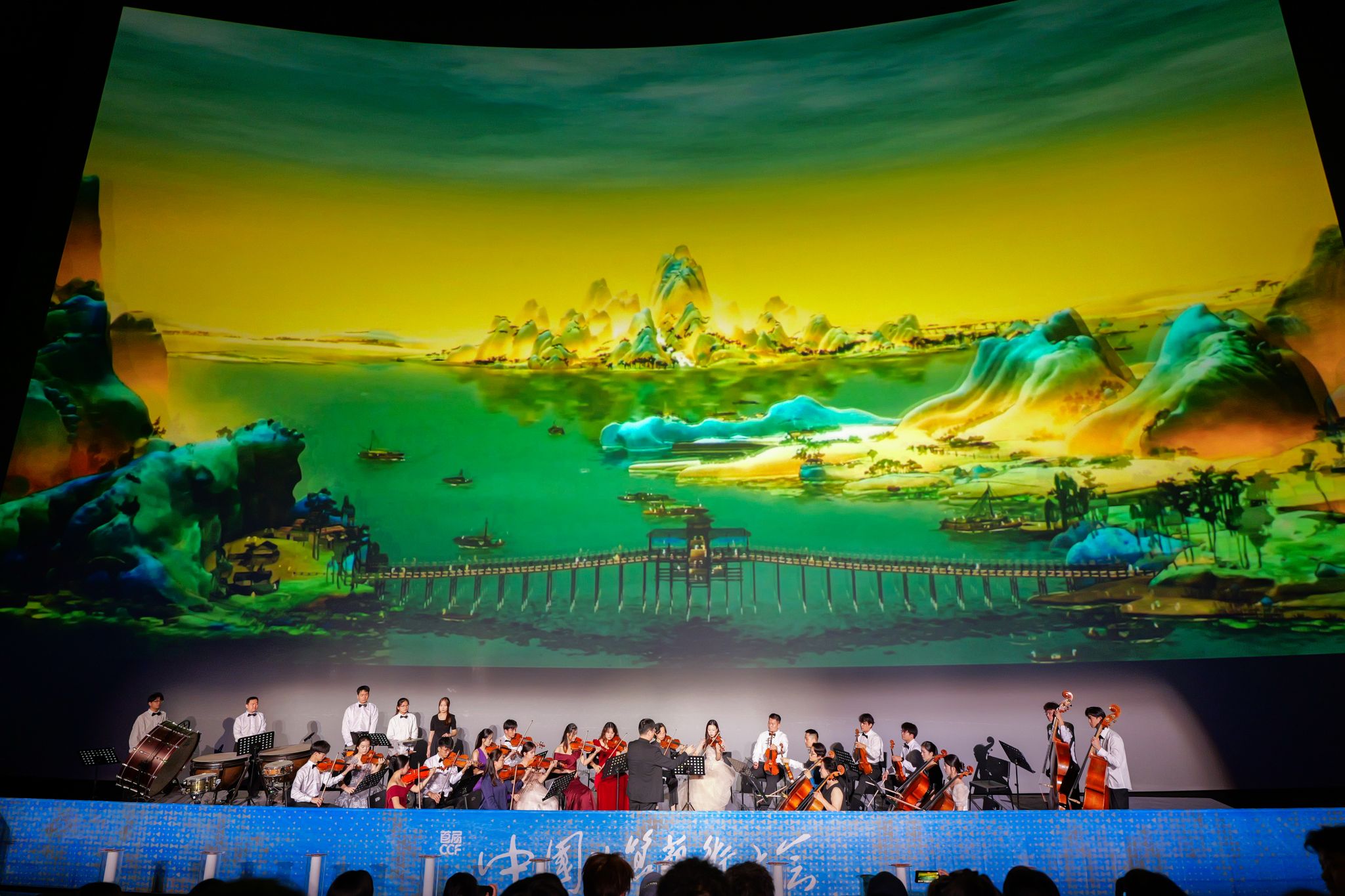 开幕式上,山东艺术学院青年交响乐团演奏了两首由AI作曲的交响乐《欢迎》和《千里江山图》,创新的音乐作品与IMAX巨幕影画结合,带观众真切体验音画交融、科技与艺术对话的生动实践,直观诠释了“人工智能重塑艺术边界”的主题内涵。