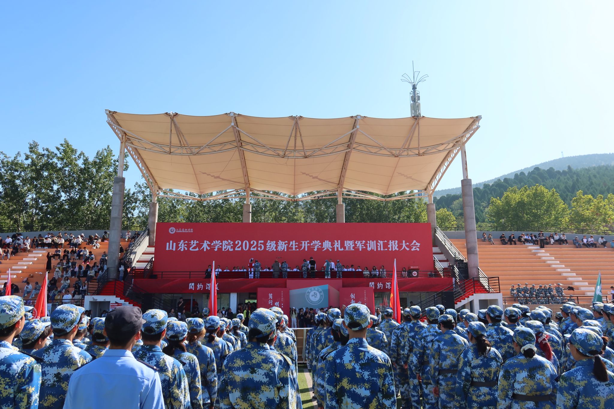 9月25日,山东艺术学院长清校区田径场上青春洋溢、朝气蓬勃,2025级新生开学典礼暨军训汇报大会如期举行。党委书记徐梅,院长徐青峰,党委副书记杨西国,副院长苏茂兴出席典礼。典礼由苏茂兴主持。