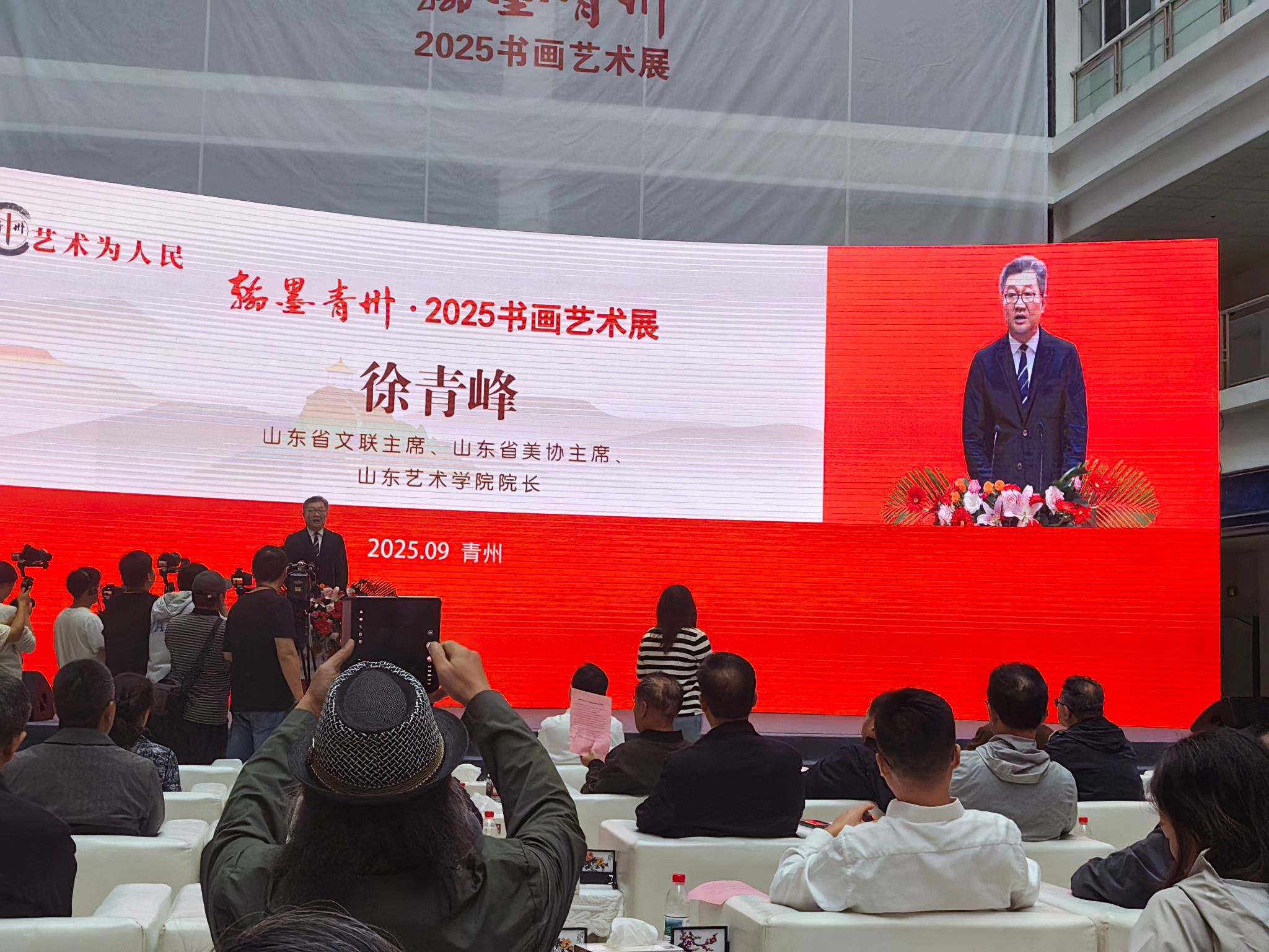 9月28日,翰墨青州·2025书画艺术展在潍坊青州开幕。山东艺术学院院长徐青峰出席开幕式并讲话。本次展会在青州中晨书画艺术产业园、青州美术馆两个会场同步举行,以“艺术为人民”为主题,突出服务宗旨,集书画艺术展示、学术交流、文化传播于一体。