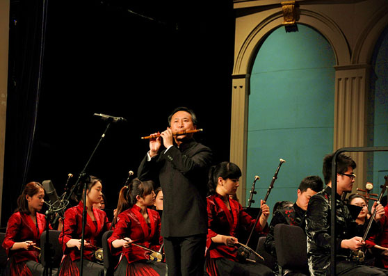 5日晚,作为本次成立大会的压轴巨作,“笛声赋”中国音协竹笛学会成立专场音乐会在上海音乐厅举行,此次音乐会也是第31届上海之春国际音乐节的子项之一。音乐厅座无虚席,新当选的副会长郝益军、唐俊乔、曲祥、孙永志、戴亚、詹永明、杜如松、张红阳、易加义、马迪、蒋国基分别为大家献上了精彩的演出。郝益军教授首个出场,演奏了自己整理的山东民间乐曲《凤阳歌绞八板》,其细腻委婉且富于歌唱性的音乐处理,博得了在场笛届专家以及现场观众的一致好评。94岁高龄的南派笛子宗师陆春龄先生携全体演奏家及新生代演奏《欢乐歌》,为音乐会划上圆满句号。