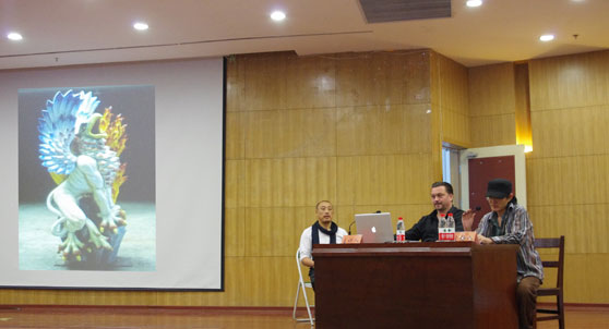 讲座中,汉斯先生就多年来为不同国家和机构创作的公共艺术作品为例,展现了艺术家驾驭不同材质、融汇不同民族艺术语言和不同时代艺术元素的才能;同时,主要以陶瓷、玻璃为载体,给广大师生诠释了特有的审美与人文特质,以崭新的视角和学术情怀,赋予了当代公共艺术更多的文化内涵,展现了汉斯先生对时代命题的思考,体现了艺术家对当代人与社会、人与公共环境空间的价值判断,呈现了艺术家的创新意义和当代价值。讲座学术视野开阔、语言妙趣横生,深入浅出,拓展了在座师生的学术思维。