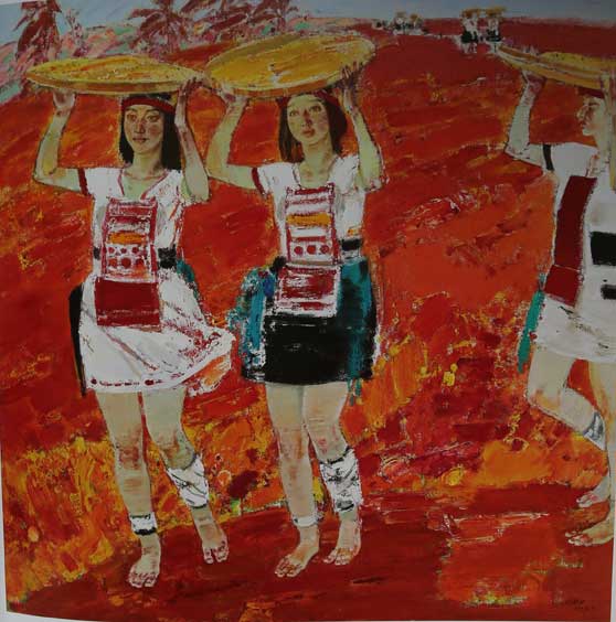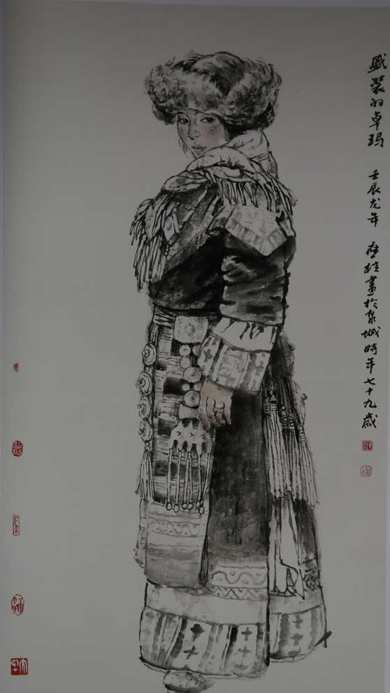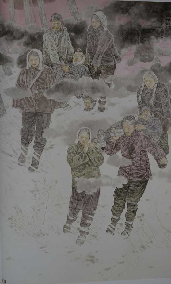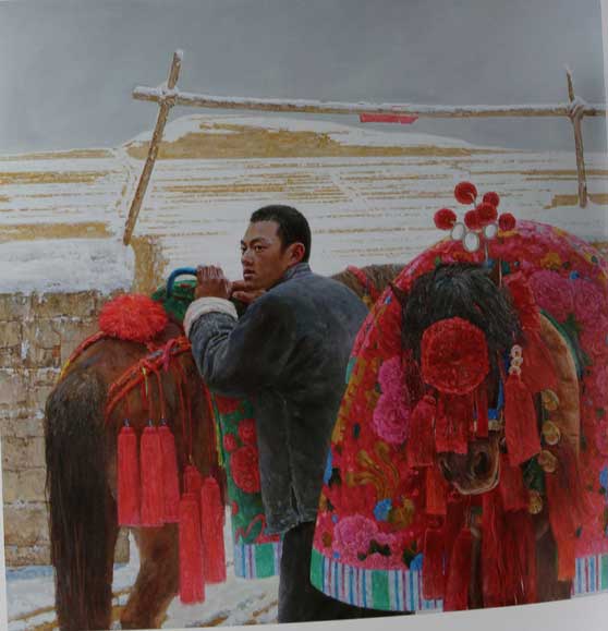 在参展作品中有两幅肖像作品,一幅是单应桂的中国画《盛装的卓玛》,另一幅是谭智群的《瑞雪》。《盛装的卓玛》塑造了西藏女孩的形象,恬静而肃穆,但又绮罗盛装,用笔轻松,用意笔表现了藏女淑貌惠心,假想含情,生动地塑造了藏女肖像。谭智群的油画《瑞雪》表现冬雪节后迎接新娘,用大红花被和缨络装饰马背,青年农民凝视远方梦想未来,是一幅有民俗色彩的油画。