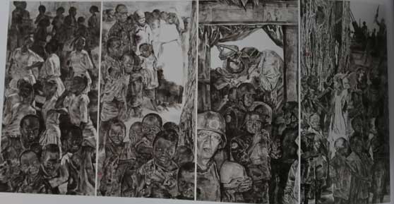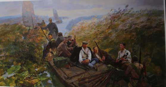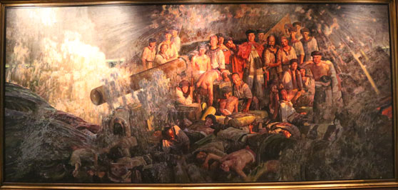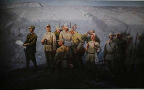 重大历史题材的作品基本以写实的表现手段再现历史的真实。写实必须求真,要表现生动的人物形象,塑造人物就成为历史画的重要课题。现实主义地表现历史,首先要把历史的真实放在首位。杨松沐《孙中山视察黄河铁桥》、王力克《甲午海战1894》、宋齐鸣《铁道游击队》、梁文博《沂蒙六姐妹》、岳海波李兆虬《沂蒙红嫂》等,作者都在收集大量历史资料的基础上,分析研究,最后画出大量草图,从中选出较准确地反映历史真实的画面作为创作的基础。这方面王力克做了大量工作,为了真实反映甲午海战的历史,翻阅大量历史资料,观看“甲午海战”电影,并到威海甲午海战纪念馆实地考察,最后确定沉船就义的场面。