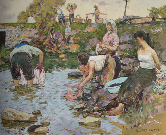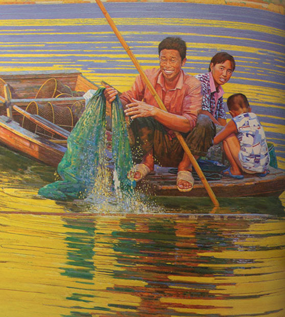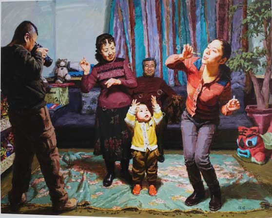 在参展的作品中,以反映现实生活为切入点的作品比重较大,而且都能体现出作者对生活的关注和主题思想的把握。像赵旸的水粉画作品《家》表现爷爷、奶奶、儿子、儿媳、孙子一家欢快的情节,这是一件非常有情调的现实主义风俗画,这种有情节风俗的表现风格近几年已被很多人遗忘了,这件作品使我们重新感受到了现实主义反映生活的魅力。