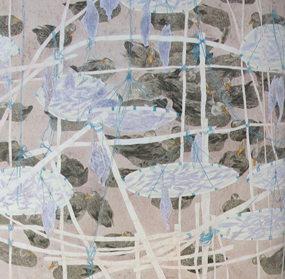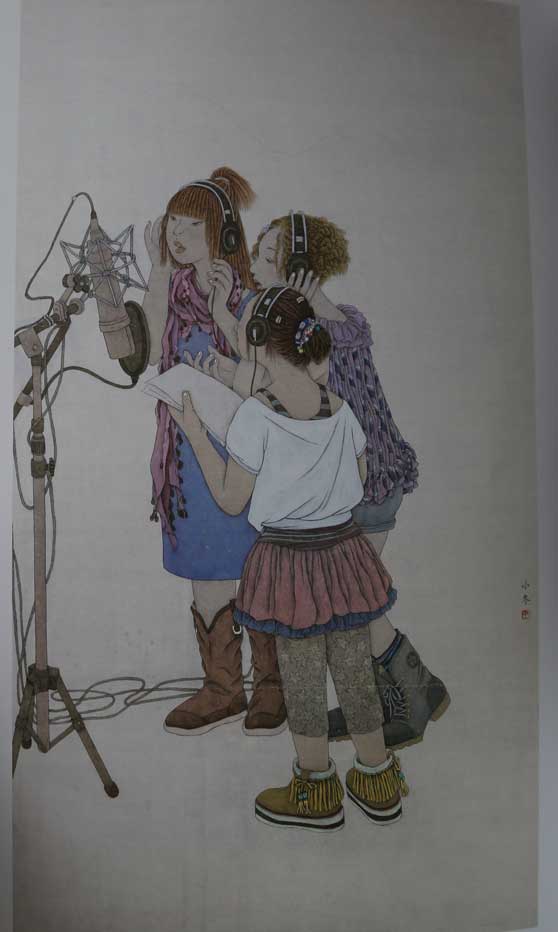 丁小东的中国画《粉红色的旋律》是表现三个女孩在广播室唱歌的情景。画面空静,突出三个孩子认真练歌的影像。孩子的平面造型与话筒的直线、曲线形成面线对比与协调,特别是话筒线的节奏、韵律非常具有优美的律动感,使画面增加了视觉的审美力度。