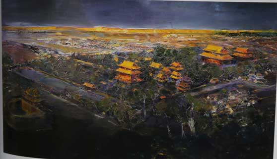 在重点历史题材作品中有一幅中国画山水和一幅油画风景,都是运用意象表现和写意手法使画面产生深沉而有想象力的效果。一幅是张志民的《风雨孔府》,另一幅是管朴学的《朝阳中的圣城》。张志民的作品《风雨孔府》是以写意探索画面的境界追求梦幻的意象效果。孔府是座持续年代最久,范围最广,保存完整的中国封建贵族庄园。孔府历经兴盛衰落,保存着丰富的历史信息,象征着“里仁为美”的儒家哲学思想,它的兴衰是印证着儒家学说发展轨迹的重要表述。作者用浓重的泼墨、积墨描绘出孔府惨淡的景象,用沉重的笔墨表现是树非树、风雨交加过的惨落面貌。作者以挥毫造化,意笔会真的写意笔法,描绘孔府的苍老岁月,使人凝视遐想其笔墨巧拙、轻重、繁减,行笔磊落及线的自由流畅,妙悟出梦境一般的孔府家园。