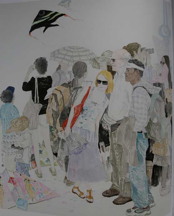 韩菊声的中国画作品《远方的客人》表现的是外国友人参加风筝节、观看风筝表演的情节。画面以黄发为核心,以优美姿态打动观众的视线,画面淡雅、轻松,色彩以女士的红挎包和黄头发为突出点,纯度相对大一些,以做为画面的重要视点。作者一改往常的画法,先以小写意笔法加进淡彩,是他的画风一大跨越。