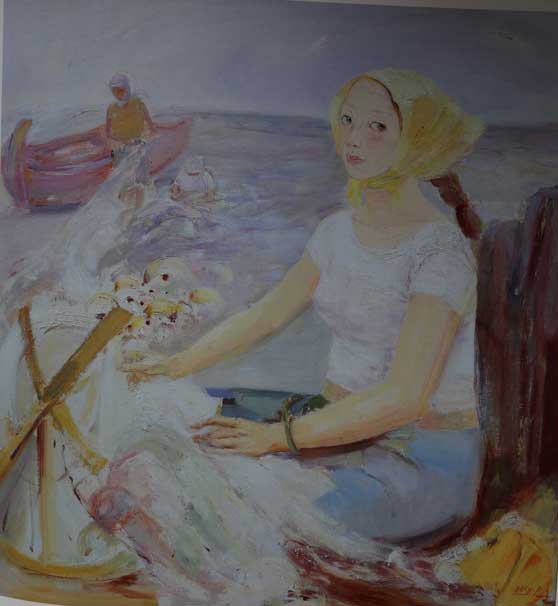 王玉萍的《银滩玉女》以浅淡的色调描绘海边上的渔女,形象恬静、靓丽,淑貌皎日,寄情在海洋。画面运笔轻松,色调优雅,是一幅唯美佳作。
