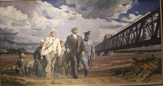 杨松林的重点历史题材油画作品《孙中山视察黄河大桥》是表现1912年初,孙中山就任中华民国临时大总统,并于当年9月26日清晨5时由天津出发抵德州,停留片刻即上车行至黄河北岸,下车登上小火轮渡至黄河南岸,及上黄河观察和测量铁桥的质量工程。画面展现出孙中山在众官员的陪同下,在雨后晴朗,薄云滚动,黄河水奔流而下的情境下,孙中山神采奕奕急上岸堤的情景。孙中山为民国的振兴而奋斗的精神体现在形象中。画面结构严谨,色调明亮,写实的功力体现出油画的真实感,使人身临其境。