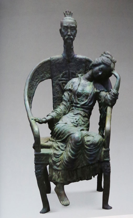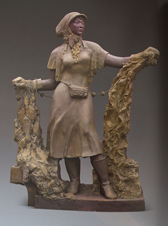 刘大力的雕塑作品《柳下惠》以象征手法诠释柳下惠的传说。鲁国柳下惠将受冻女子裹于怀中同坐一夜无非礼之事,成为“坐怀不乱正人君子”的典故。作者把柳下惠做成圈椅让女子在“怀里”沉睡,巧妙的象征为雕塑作品增加情趣。《海的女儿》是李振才的新作,以整体的造型使作品增强了建筑感、体量感。丰富的鱼虾和海带等垒成整体的造型,与人物的大块面形成有节奏和韵律的对比。海女形象含情无语,是件唯美的艺术品。