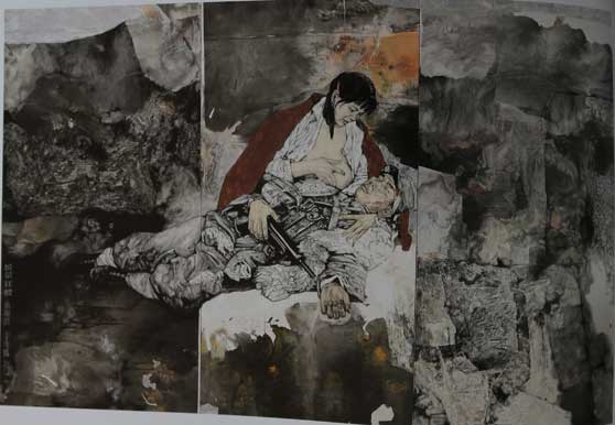 岳海波李兆虬的重点题材中国画作品是《沂蒙红嫂》。闻名遐迩的“沂蒙红嫂”是沂蒙山区广大妇女拥军支前的光辉形象。1941年日寇进犯我沂蒙,军民奋勇抗战,八路军战士身受重伤,被哑妇明德英救助,而战士失血过多生命垂危,明德英悉力养护,以乳汁喂养,继而得救。