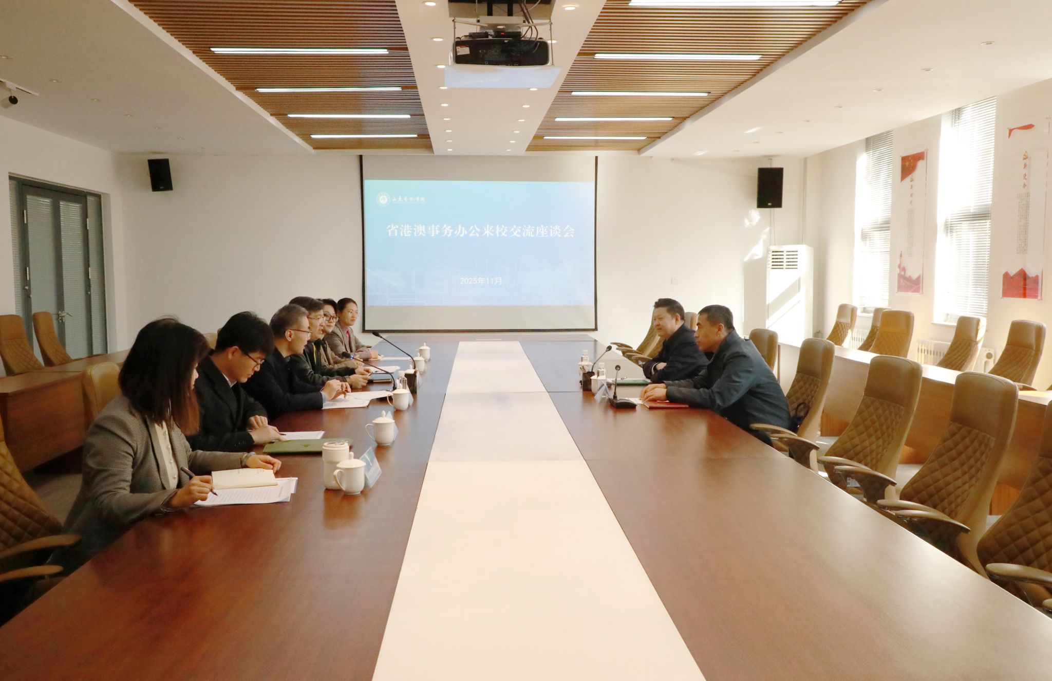 11月13日,山东省人民政府港澳事务办公室港澳一处处长吴曲波一行来我校交流座谈。学校党委统战部(台港澳事务办公室)、音乐学院、戏曲与曲艺学院、书法学院等相关单位负责人、教师代表参加会议,会议由党委委员、副院长苏茂兴主持。