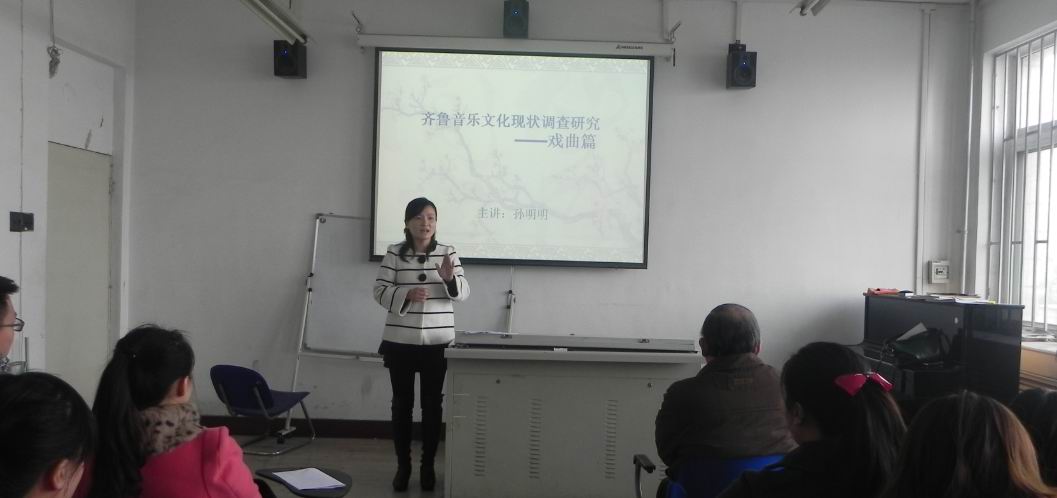 刘慧老师作了题为《做音乐文化的局内人》的报告,结合田野工作的实例讲述了音乐文化工作者在面对他者音乐文化时所应采取的观念:应当带着主位、客位,局内、局外的眼光,将音乐放置到生成它的文化环境中去研究。陈俊伊老师作了题为《音乐与健康人生》的报告,以工作坊的形式通过引导音乐想象让全体师生体验在音乐中发现积极资源、用音乐强化积极资源的手段来处理人生中的不愉快。孙明明老师作了题为《齐鲁音乐文化现状调查研究——戏曲篇》的报告,以戏曲为切入点,在一手调查资料的基础上,对山东省内的戏曲品种的发展现状进行了通报。李玲老师作了题为《对< 音乐作品分析>课程的思考》的报告,以该课程的点滴教学经验入手,提出应对音乐作品进行综合分析,力求在形成音乐作品的全方位技法因素基础上理解作品,提高认识水平和实际分析能力。