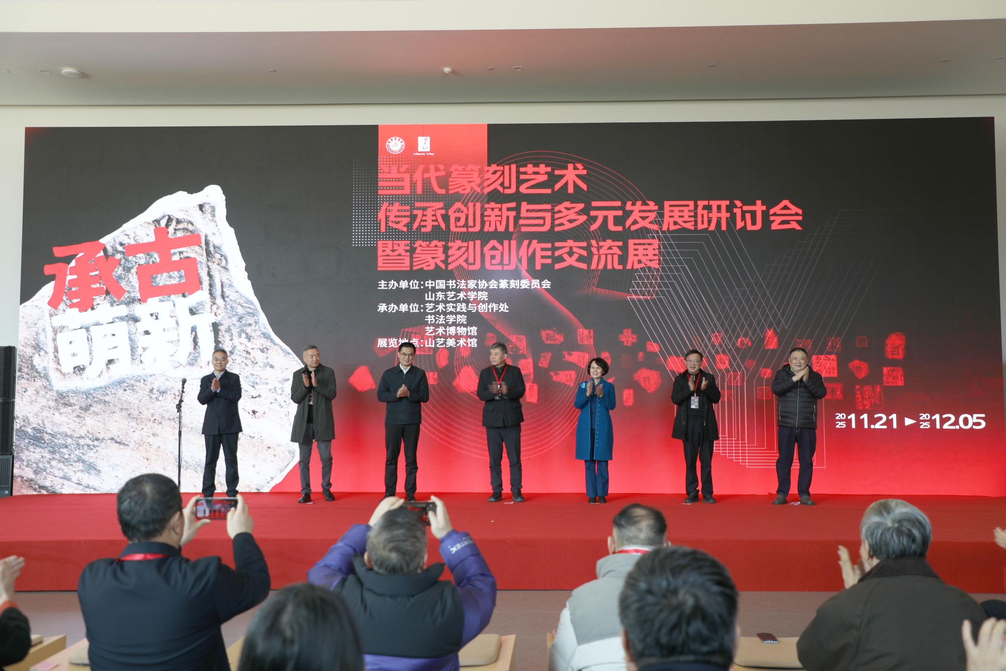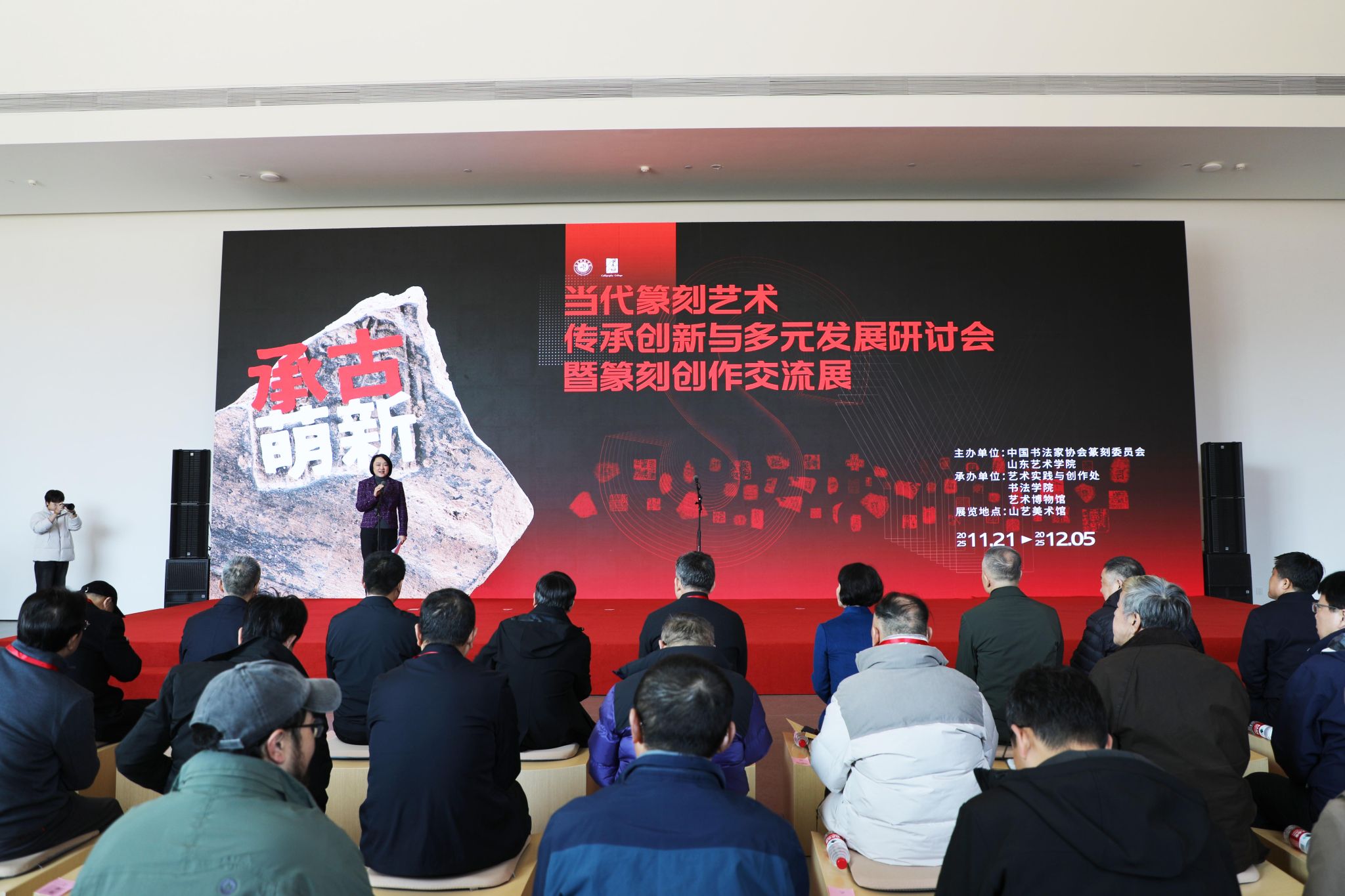 11月21日,“承古萌新:当代篆刻艺术的传承创新与多元发展研讨会暨篆刻创作交流展”在我校举办。学校党委书记徐梅,中国书法家协会副主席、篆刻委员会主任王丹,南京艺术学院副院长、教育部书法教育指导委员会副主任委员李彤,山东省书法家协会主席王瑞出席开幕式并致辞。开幕式由副院长彭丽主持。