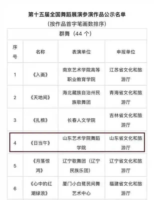 近日,文化和旅游部正式公示了第十五届全国舞蹈展演参演作品名单。我校舞蹈学院原创舞蹈作品《日当午》成功入选,并将代表学校登上国家级展演平台。