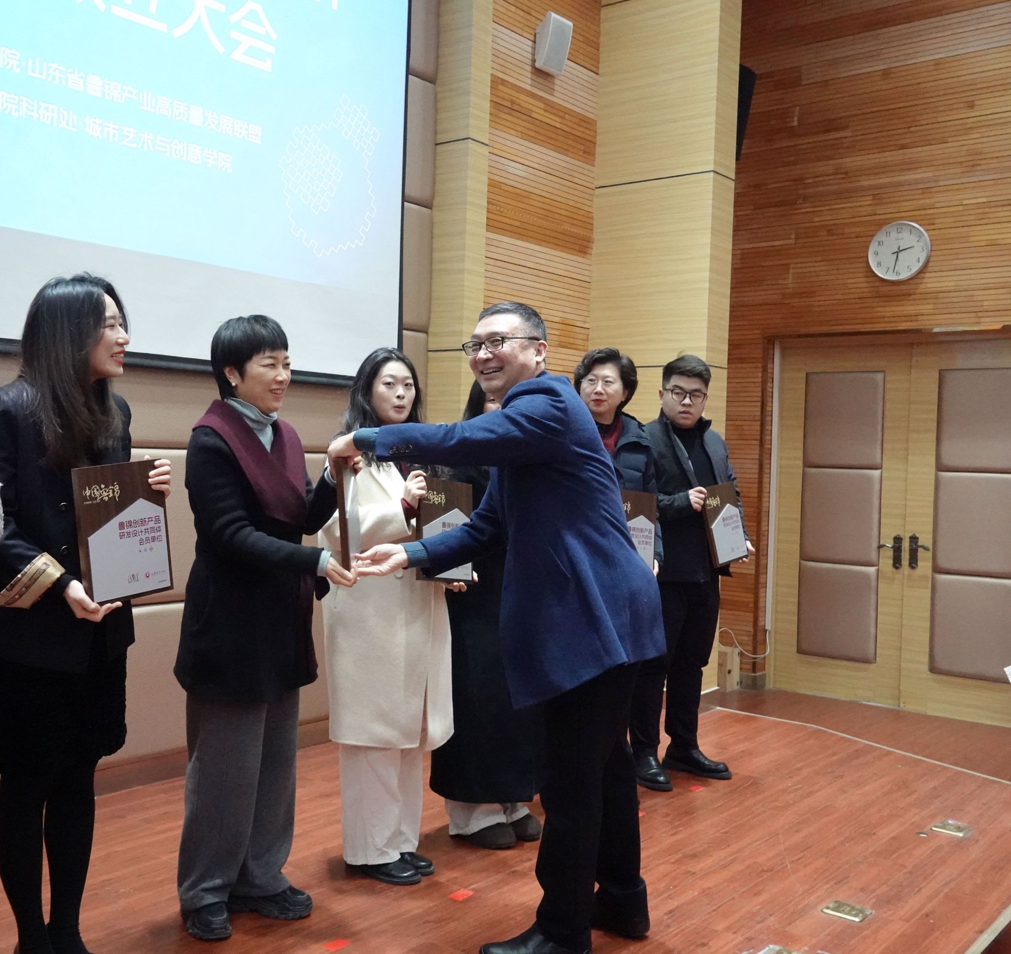 成立仪式上,与会人员共同观看了学校宣传片。城市艺术与创意学院院长、鲁锦产业高质量发展联盟副理事长兼秘书长、鲁锦创新设计研发中心负责人王大海汇报了共同体筹备情况、成员构成与发展规划。韩文涛与工信厅领导共同为各成员单位授予“鲁锦创新产品研发设计共同体会员单位”牌匾。
