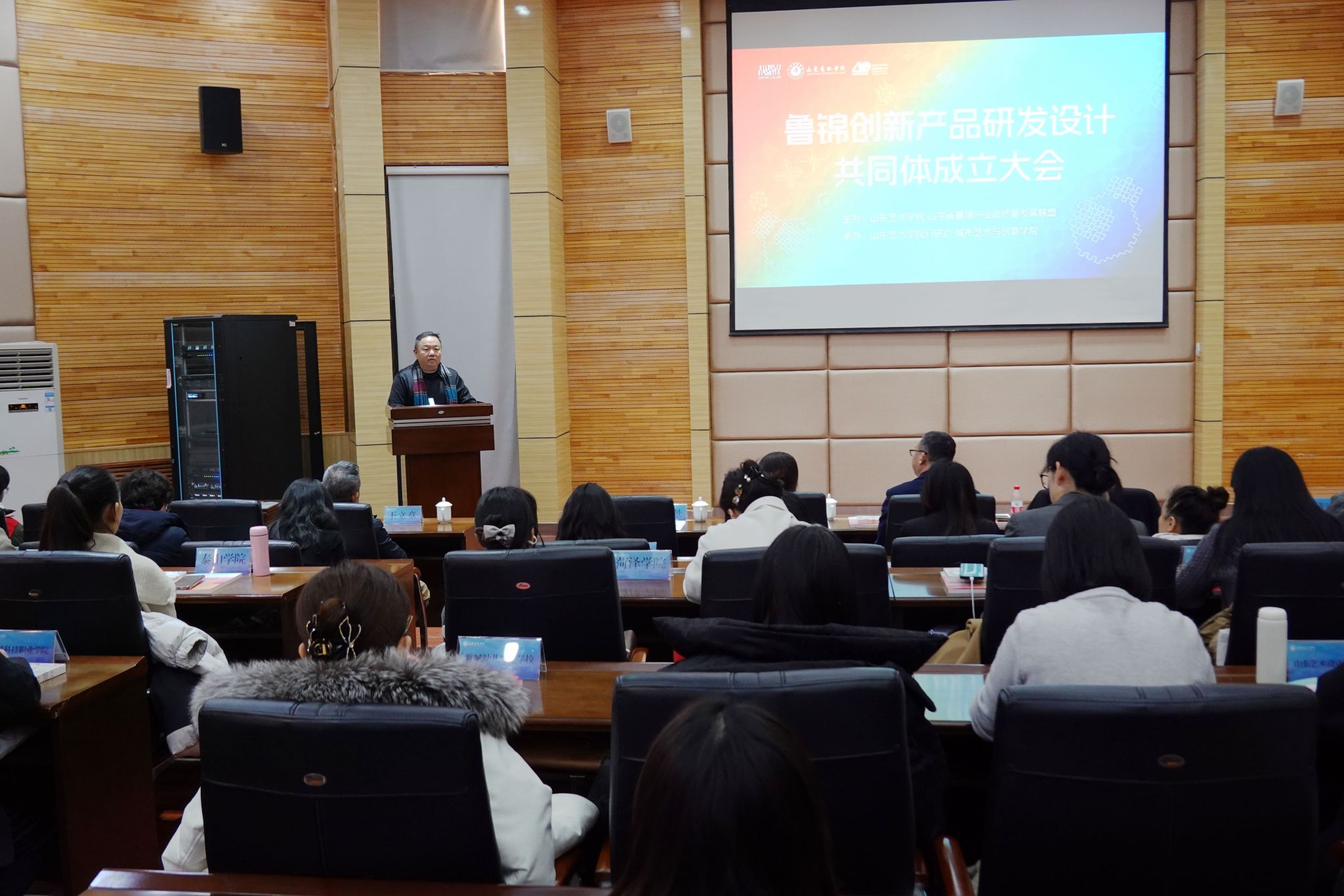 12月16日,鲁锦创新产品研发设计共同体成立大会暨研讨会在我校长清校区举行。山东省工业和信息化厅轻工纺织产业处副处长朱喆,学校党委委员、副院长韩文涛出席活动并致辞。共同体成员单位代表,学校科研处、城市艺术与创意学院相关负责人参加活动。共同体成立仪式由科研处处长胡春景主持。