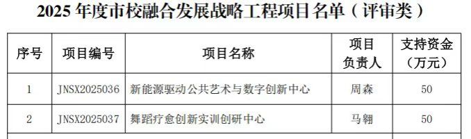 近日,济南市教育局办公室公布了2025年度市校融合发展战略工程项目立项名单。我校组织申报的《新能源驱动公共艺术与数字创新中心》《舞蹈疗愈创新实训创研中心》两个项目入选,分别获得50万元资金支持。至此,自2021年济南市启动市校融合项目以来,学校已成功获批7个项目,共获经费资助550万元。