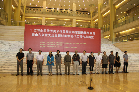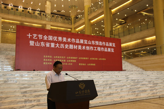 7月20日上午10时,十艺节全国优秀美术作品展览山东预选作品展览暨山东省重大历史题材美术创作工程作品展览在山东省博物馆隆重开幕。山东艺术学院党委书记李宗伟作为“十艺节”山东省筹委会群文美术部部长出席并主持画展开幕式。山东省美协主席、山东艺术学院院长张志民同山东省委常委、宣传部长孙守刚,山东省委宣传部副部长、省文化厅厅长徐向红等领导一同出席画展开幕式。开幕式结束后,党委书记李宗伟、院长张志民陪同出席开幕式的省领导观看了画展。