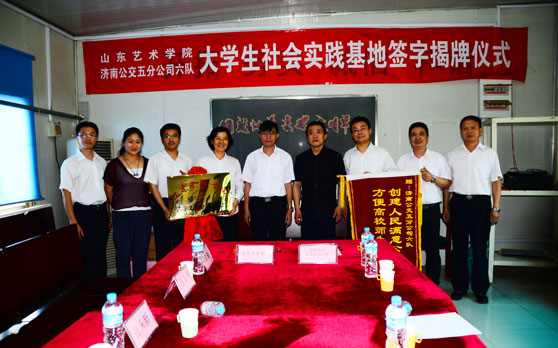 仪式上,我校党办院办负责人向济南市公交总公司副总经理颜廷虎赠送了锦旗和慰问品,校团委相关负责人和济南市公交总公司五分公司六队队长盖学军共同签署了“山东艺术学院、长清公交营运中心大学生社会实践基地合作共建协议书”,校团委负责人和济南市公交总公司五分公司负责人共同为“山东艺术学院大学生社会实践基地”揭牌。我校党办院办负责人代表学校讲话,简要介绍了我校的基本情况,对济南公交公司调整24路公交车运行路线、方便我校师生出行表示感谢,对大学生社会实践基地建立的意义进行了阐述。济南市公交总公司副总经理颜廷虎表示,调整24路公交车运行路线,是公司方便师生出行、加强行风建设的一项重要举措,建立大学生社会实践基地,对于校企双方是一件互利共赢的好事。