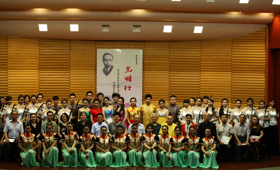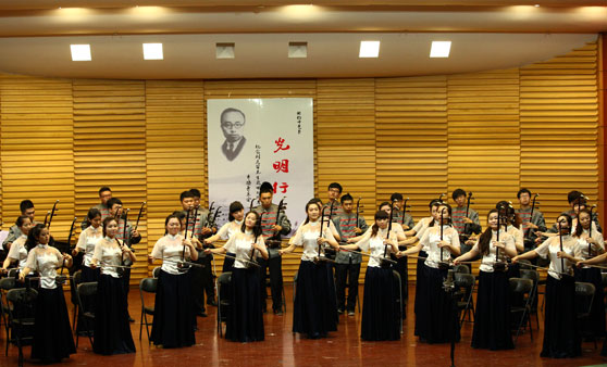 音乐会由我校彭丽教授担任导聆,其对刘天华及其作品深入浅出的讲解把听众带入到80多年前刘天华的音乐世界。由24位琵琶学生演绎的齐奏《歌舞引》为音乐会拉开序幕。《歌舞引》作于1927年春天,是刘天华创作的第一首琵琶曲,曲子借鉴了许多古琴的演奏手法,体现出作曲家对传统音乐的继承与发扬。之后,《苦闷之讴》、《月夜》、《烛影摇红》、《闲居吟》、《改进操》、《虚赖》、《病中吟》等一首首经典二胡曲、琵琶曲以丰富多样的演奏形式展现给大家。其中,由张令杰教授演奏的二胡独奏曲《病中吟》抑扬交替,时而幽咽微吟,时而激愤高歌,时而深情倾诉,时而呻吟叹息,将刘天华这首作品中饱含的内心的苦闷和彷徨表现的淋漓尽致。音乐会最后,41位二胡专业学生共同演奏了《光明行》,全曲生机勃勃、旋律明快坚定,当乐曲进行到第三段,台上演奏人员全体起立,随着军鼓的伴奏,犹如人们踏着矫健步伐,昂首阔步地前进,充满勇往直前的进取精神和对光明前途的乐观自信。精彩的演出赢得了在场观众热烈而持久的掌声。