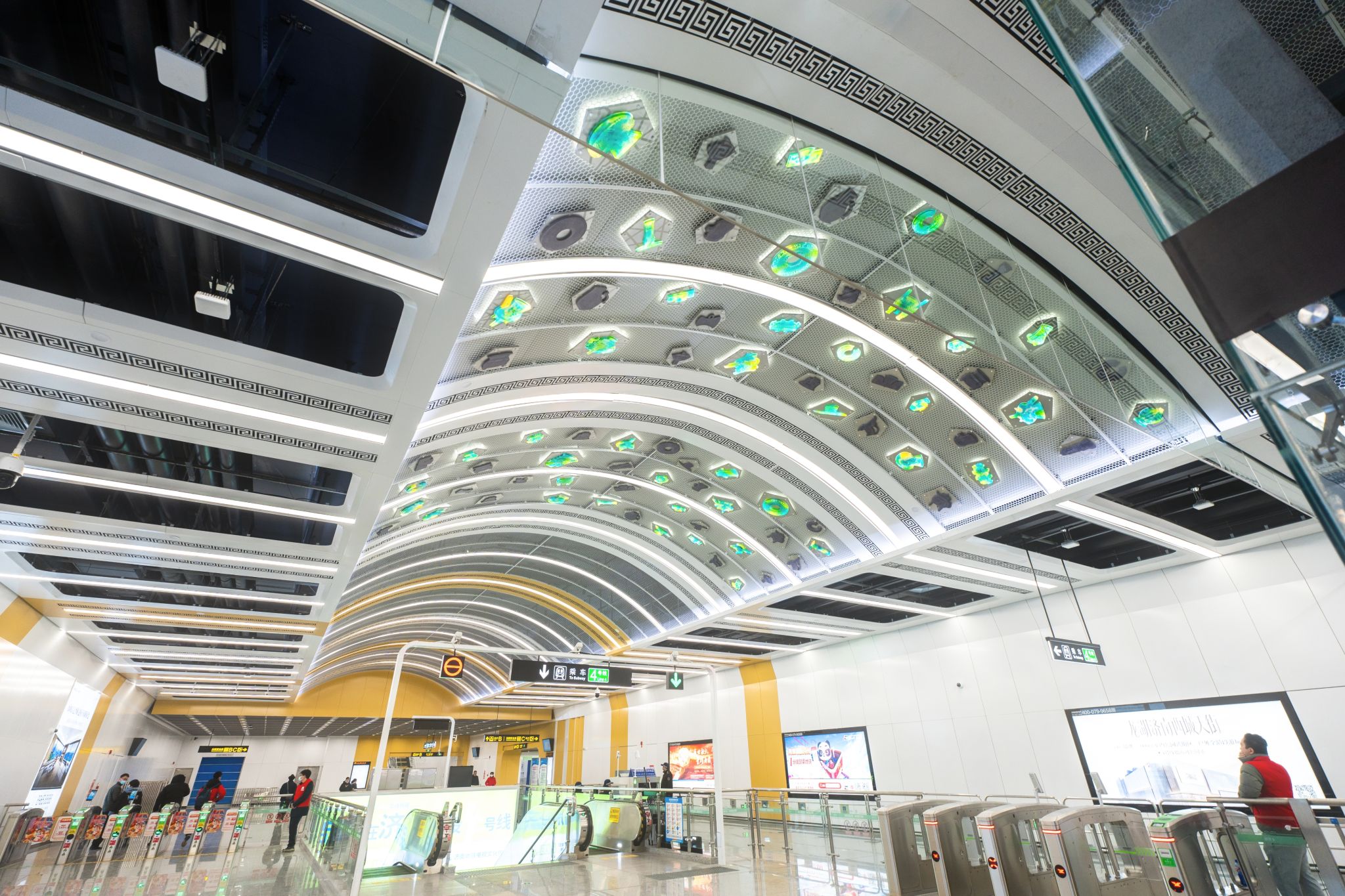 该站艺术品位于站厅层的顶部,与原装修的弧形穹顶空间相结合,分别位于两个进出站的闸机位置,也恰好处于上下楼梯仰视视域内,使站厅空间穹顶的装饰感和视觉观赏体验更加完整,也更好的体现了文物是历史星空的璀璨之光的寓意。《璀璨往来》中文物器型式样的设计元素选自省博文物,器物的齐鲁文化身份突出,具有典型的文化代表性和识别性,更好的契合了山东博物馆站的站点定位,也让乘客在地铁空间内有了进一步感受文物美感的不同体验。
