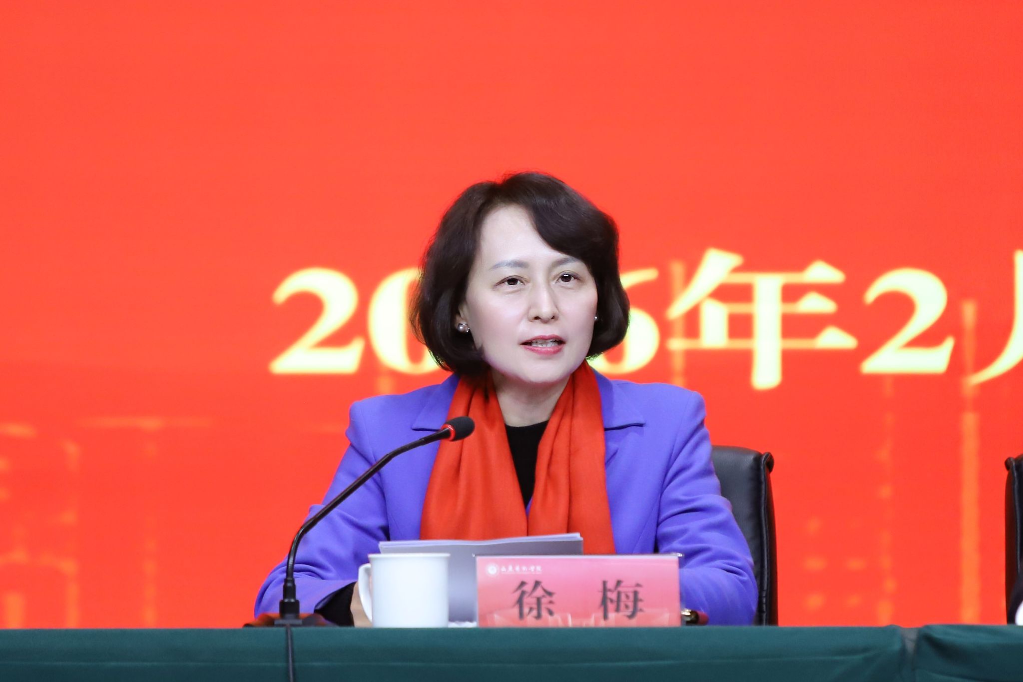徐梅强调,2026年作为“十五五”规划开局之年,学校必须以“领跑者”思维、“开局者”担当、“攻坚者”魄力,抢抓机遇、乘势而上,重点在四方面聚焦聚力、务求实效。一是聚焦政治引领,固本强基,以更高站位把牢办学治校方向盘。要强化理论武装、把稳办学方向;要建强组织体系、锻造战斗堡垒;要抓实干部队伍、激发中坚活力;要推进从严治党、涵养优良生态。二是聚焦内涵建设,提质增效,以更实举措构筑事业发展新高地。要集中力量在五大领域攻坚突破,人才培育抓“质量革命”,育新人、建强师;科研创作求“顶天立地”,出精品、树标杆;社会服务强“精准实效”,优服务、提能级;国际办学促“提质升级”,拓格局、扩影响;治理效能谋“系统优化”,激活力、保高效。三是聚焦深化改革、系统集成,以更大魄力激活内生发展动能。要强化系统思维,统筹协同推进;要敢破深层壁垒,攻坚核心难题;要健全激励机制,营造创新氛围。四是聚焦锤炼作风、求真务实,以更强保障凝聚干事创业合力。要厚植师生情怀,践行群众路线;要树立正确政绩观,力戒形式主义;要提振干事精气神,破除“躺平”顽疾。