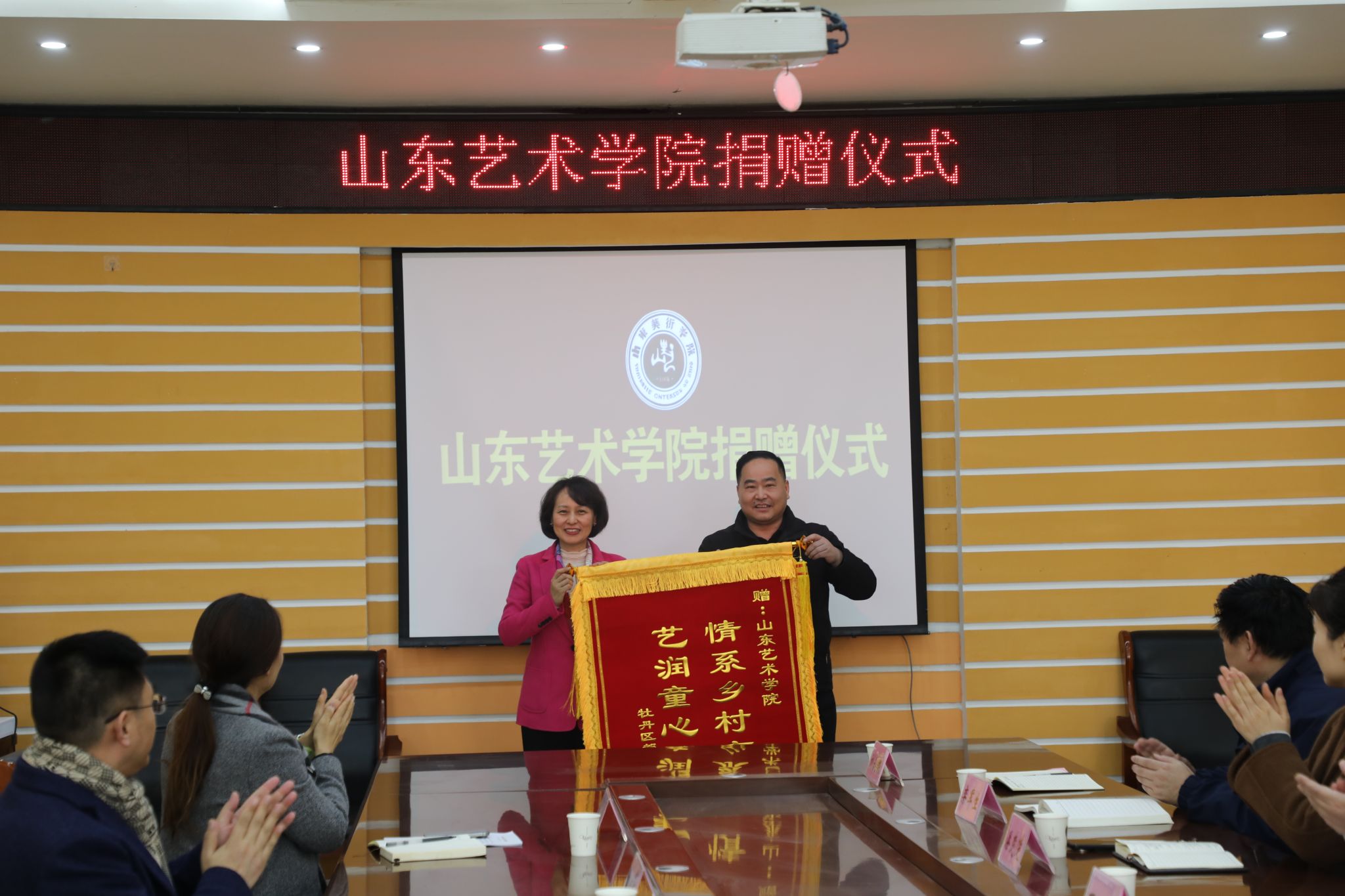 徐梅代表学校向都司镇中心小学捐赠钢琴、电脑等物资,并接受都司镇中心小学回赠的锦旗。她表示,学校愿意为乡村振兴和乡村教育尽绵薄之力,希望加深与乡村小学的合作交流,共同探索艺术教育和乡村教育的深度融合。