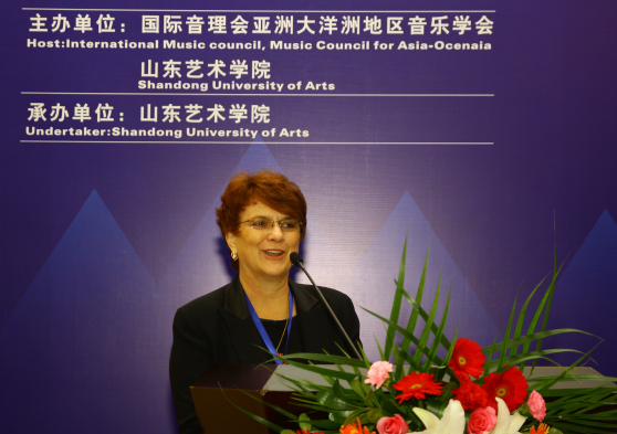 国际音理会亚洲大洋洲地区音乐学会会长Helen Lancaster(海伦•兰卡斯特)致词。Helen Lancaster会长认为,今天这个场合意义非凡,是亚太民族音乐学会第十七届年会,同来自于亚太地区有着不同音乐文化背景的音乐家们相聚在这里,形成了一个多元化的交流平台。同时,对于个人来说,这也是个非常特殊的场合,因为山东艺术学院已与其母校昆士兰音乐学院签订了交换协议。她说,亚太民族音乐学会不仅是世界上此领域成立时间最久的组织,并且是最具影响力的组织之一。她期待在未来的会议期间,能够听到许多鼓舞人心的演讲,达成一些激动人心的合作,并相信大家长久持续建立的友谊将会帮助那些新兴的年轻音乐组织成长壮大。