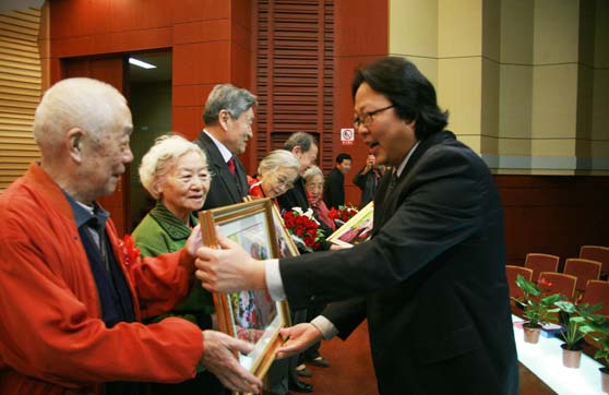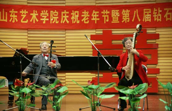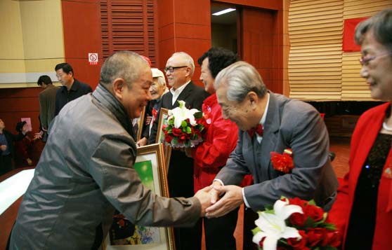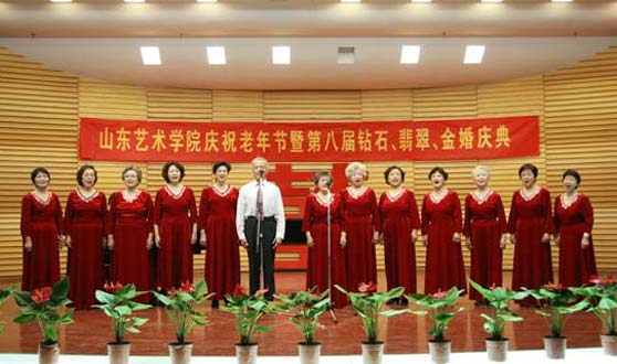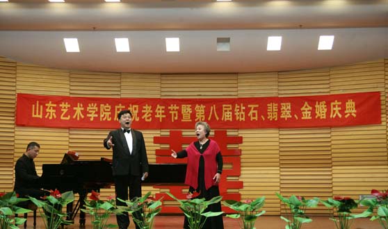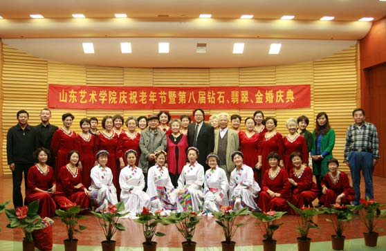 庆典仪式上,张志民院长、王力克副院长向风雨同舟60年、55年、50年的11对钻石、翡翠、金婚伉俪赠送了结婚纪念照片。庆典仪式结束后,老艺术家们与在职教师同台演出,以精彩的文艺节目,共庆老年节。