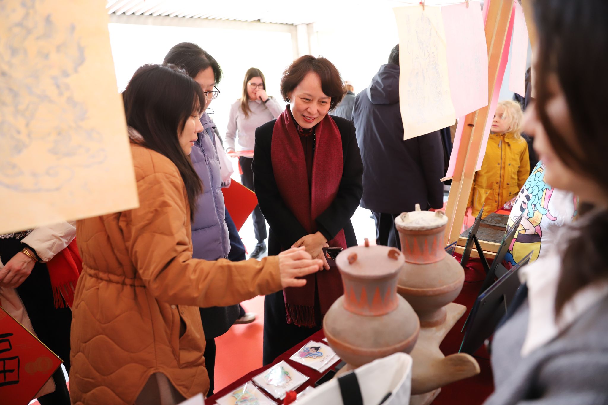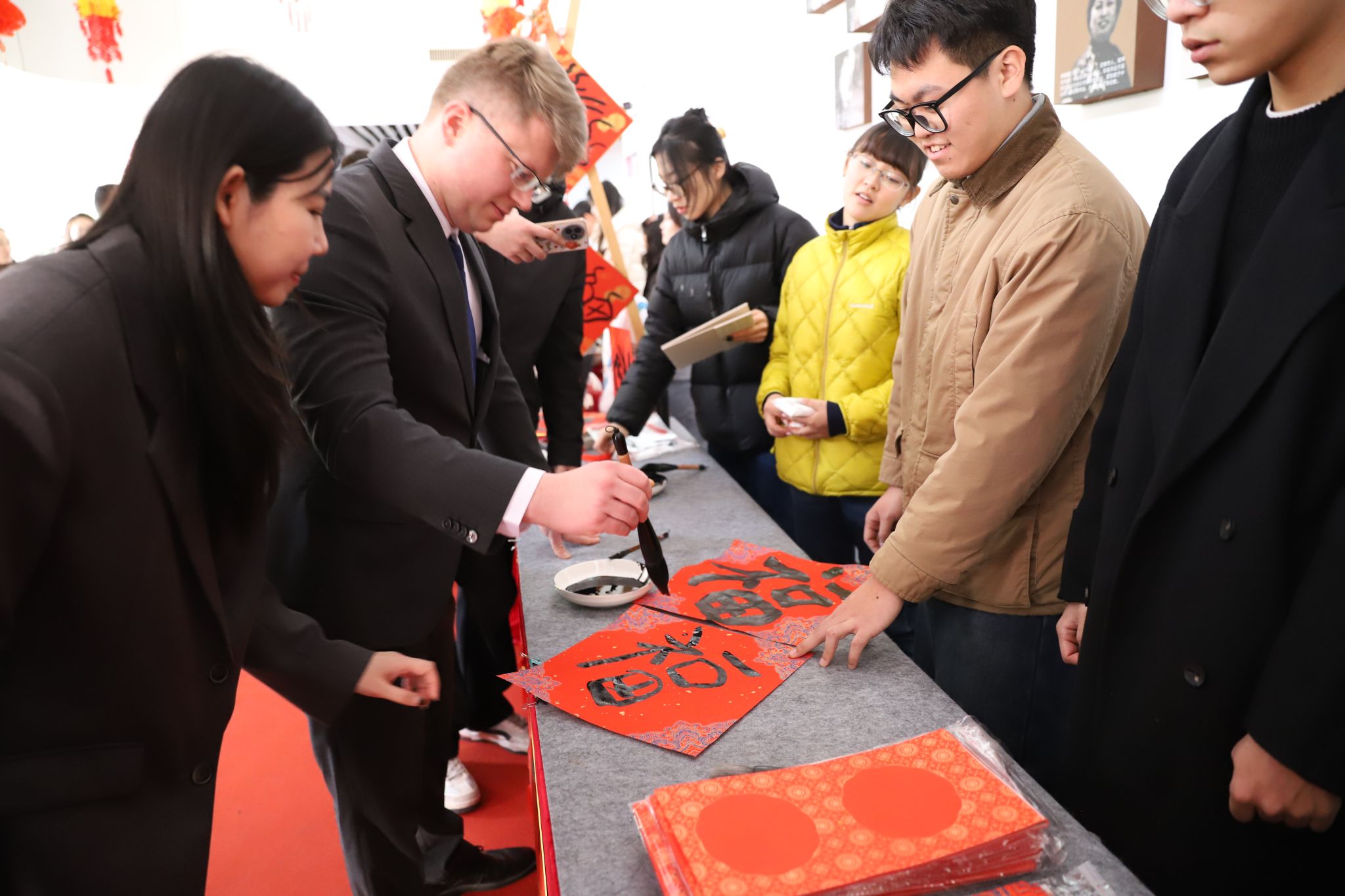 活动期间,我校团委、书法学院和艺术博物馆的师生们还设置了团扇手工制作、学写福字和年画印制等体验项目,志愿者们现场演示并指导来访嘉宾亲身体验中华优秀传统文化与非遗技艺的独特魅力,大家在互动中深深感受到中国春节的深厚文化底蕴。