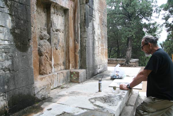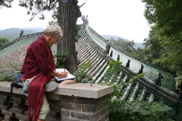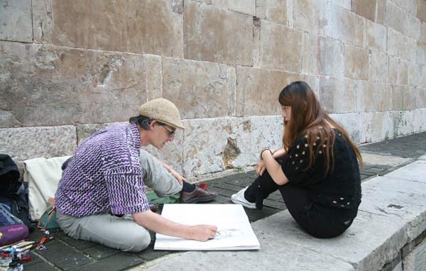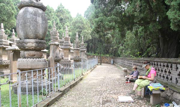 在灵岩塔、慧崇塔、墓塔林、千佛殿等景点,画家们先是静静地细心观察、体悟,然后用手中的画笔描绘佛教文化的悠久、深厚与灿烂。尤其是面对灵岩塔、慧崇塔基座上丰富的壁画,画家们认真地临摹起来,给他们带来丰富的启发和灵感。灵岩寺的游客与导游非常热情友好,自发地给画家当起了模特。准备返回的时候,正值灵岩寺的僧人做晚课,画家们不顾劳累与饥饿,饶有兴致地观看晚课,并将这一切化作独特的创作题材。