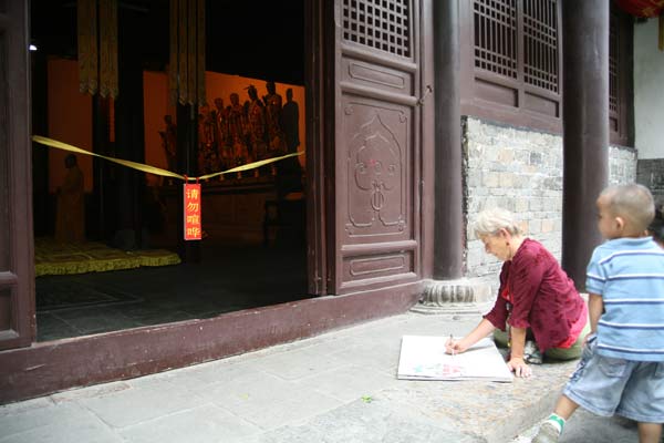 8月13日,参加“齐鲁巡礼——西方画家眼中的山东”大型系列艺术创作济南站活动的法国游记画家们来到灵岩寺,体悟千年古刹博大精深的佛教文化。