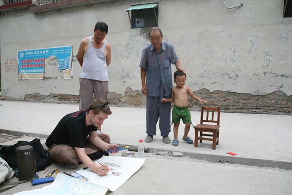 上午10时许,画家们乘车通过1980年建设的黄河公路大桥,来到大桥镇。在八里村,他们走进村民家里,通过简单的中文口语同村民聊天,并开始作画,富有浓郁的齐鲁乡土气息;在黄河森林公园,他们在与游客的聚餐之时,仍然不忘创作,并与游客合影留念;在黄河浮桥上,他们用双脚体验行船般的感受,或远望黄河铁路大桥,或置身浮桥之上,或与黄河岸边的沙泥“亲密接触”,都给画家们带来与众不同的艺术感受,我们的母亲河——黄河也以这种方式走进法国游记画家的心里,在他们的画笔下不时澎湃起来。