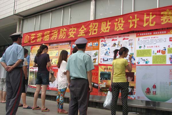 5月29日上午,我校首届消防安全招贴设计比赛作品展在长清校区饮食中心南门广告墙举行。