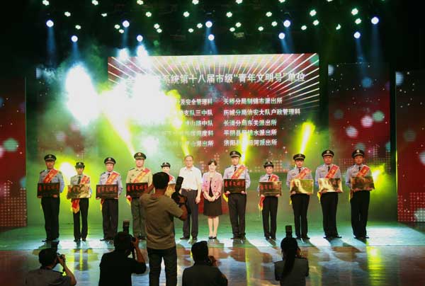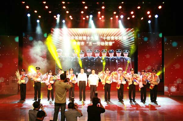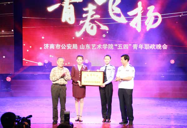 演出过程中还进行了热烈隆重的颁奖仪式和揭牌仪式。济南市委常委、政法委书记刘杰、团市委书记赵毅为全市公安系统第十八届市级“青年文明号”集体颁了奖,团省委副书记、省青联主席、山东青年政治学院党委书记张涛、我校党委书记任运河为山东艺术学院2011年度“优秀团员标兵”颁了奖,济南市委常委、市总工会主席王以才、济南市公安局局长刘新云为济南市公安系统第十九届“十佳青年民警”颁了奖,并与受到表彰的集体和个人合影留念。根据晚会前的“激扬青春 警学共建”协议,我校决定在济南市公安局设立大学生社会实践基地,成为这个青年节最珍贵的礼物。晚会上,济南市公安局政委郭心敬、我校张志民院长共同为“山东艺术学院大学生社会实践基地”揭牌。