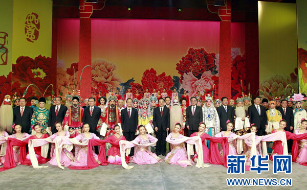 演出结束后,胡锦涛等党和国家领导人走上舞台,同演职人员亲切握手,祝贺演出成功。