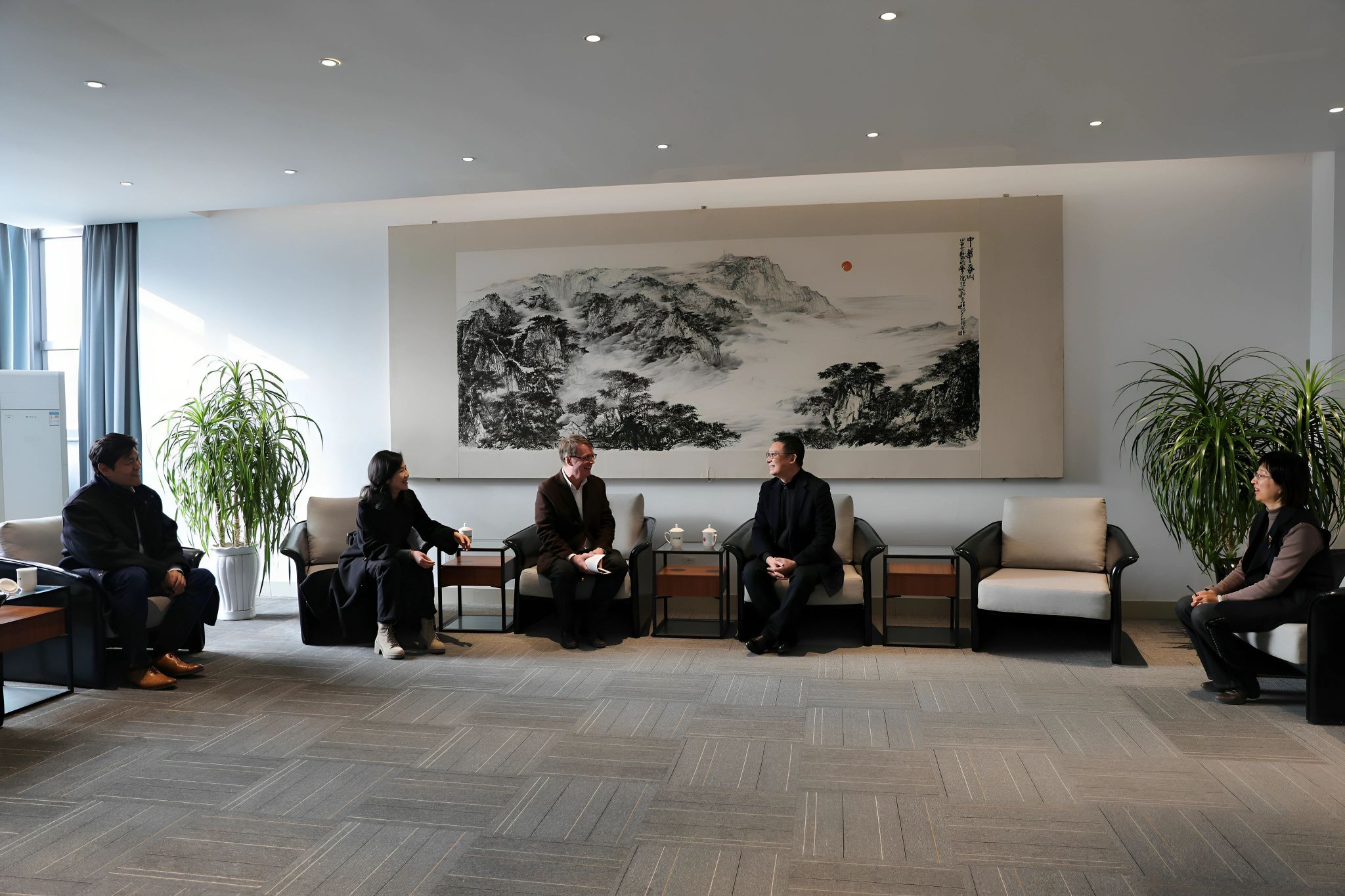 Frank Corliss还参观了院长徐青峰教授的画室。徐青峰分享了其作品《日照金山》创作理念与心路,作为央视频《千里江山如画》主题创作的重要组成部分,《日照金山》表达了艺术家对祖国山河的深情告白,对新时代中国蓬勃生机与活力的生动刻画。双方就东西方文化艺术的特点与融合,以及未来两校潜在的合作进行了深入探讨。