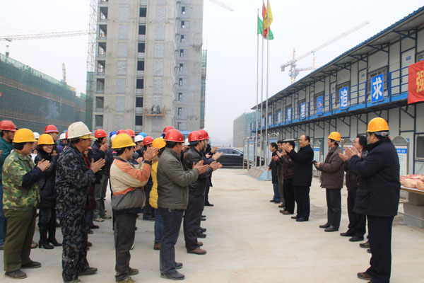 上午10时,寒冬中的工地现场,工友们各个喜气洋洋。校党委书记任运河一行来到工地,为工友们送来慰问品。高启光副院长在慰问仪式上代表学校全体教职员工对为艺术学院住宅建设付出辛勤劳动的广大工友表示了感谢。高启光副院长说,自长清校区住宅建设誓师大会召开以来,工友们克服多种困难,不畏严寒,努力工作,经过奋战,春节前全部主体封顶的阶段性任务即将完成,受山艺全体教职员工委托,今天特来到工地表示慰问和感谢。现场工人对学校的慰问和关心纷纷表示感谢,并表示将继续克服困难,努力奋战,保质保量地完成建设任务。