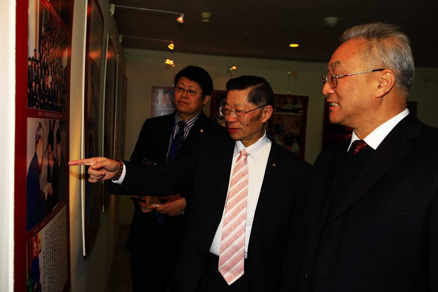 海峡两岸关系协会副会长张铭清(右)台湾海峡两岸和谐文化交流协会会长陆炳文(中)与我校外聘摄影研究生导师吴思强(左)在观看展览