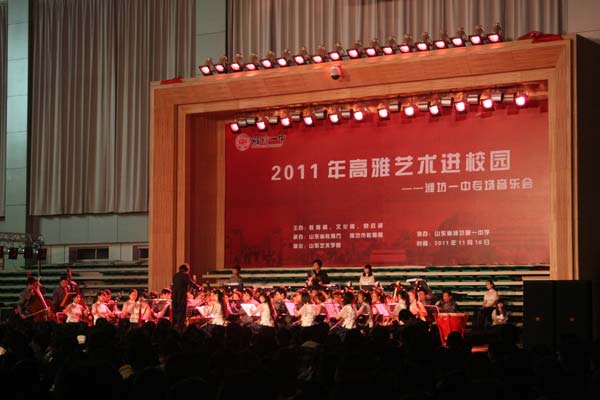 11月16日至18日,山东艺术学院青年民族乐团在潍坊七中、潍坊一中、潍坊科技学院、潍坊工程职业学院等四所院校进行了高雅艺术进校园的演出活动。